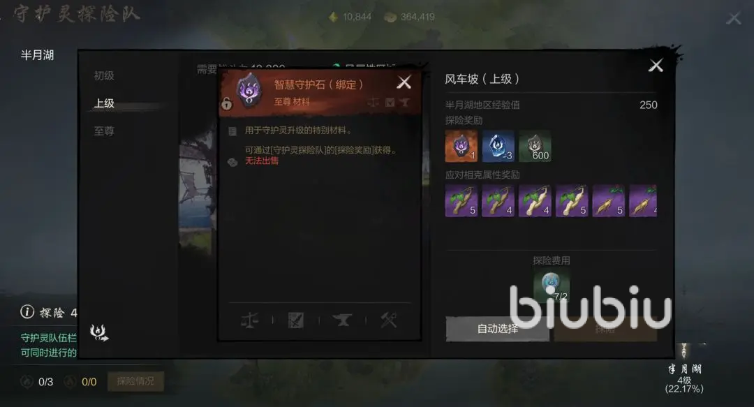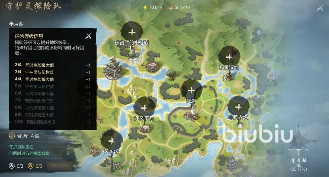 半月湖有7个探险点,每个都有初,上,至尊三个等级,探险等级提高,守护灵队伍栏数量和能同时探险的数量也会提高,探险等级最高能拉到10级,探险等级越高,相同时间获得的奖励就越多,通过挑战更高等级就能拿到更多的奖励。