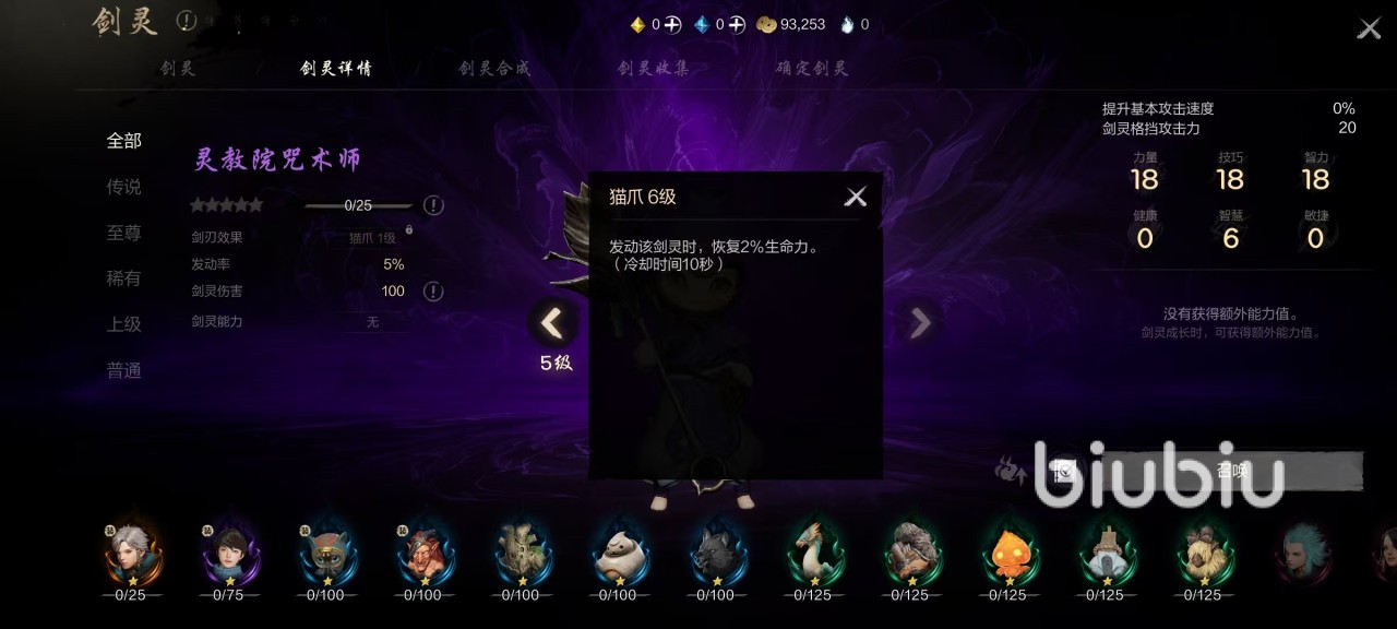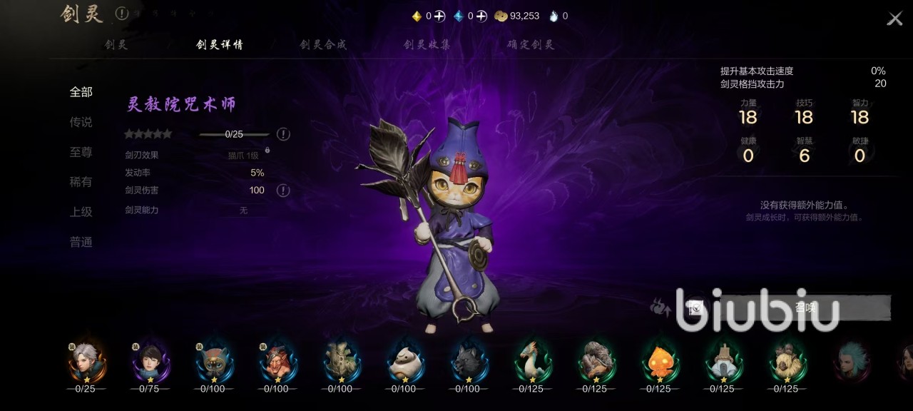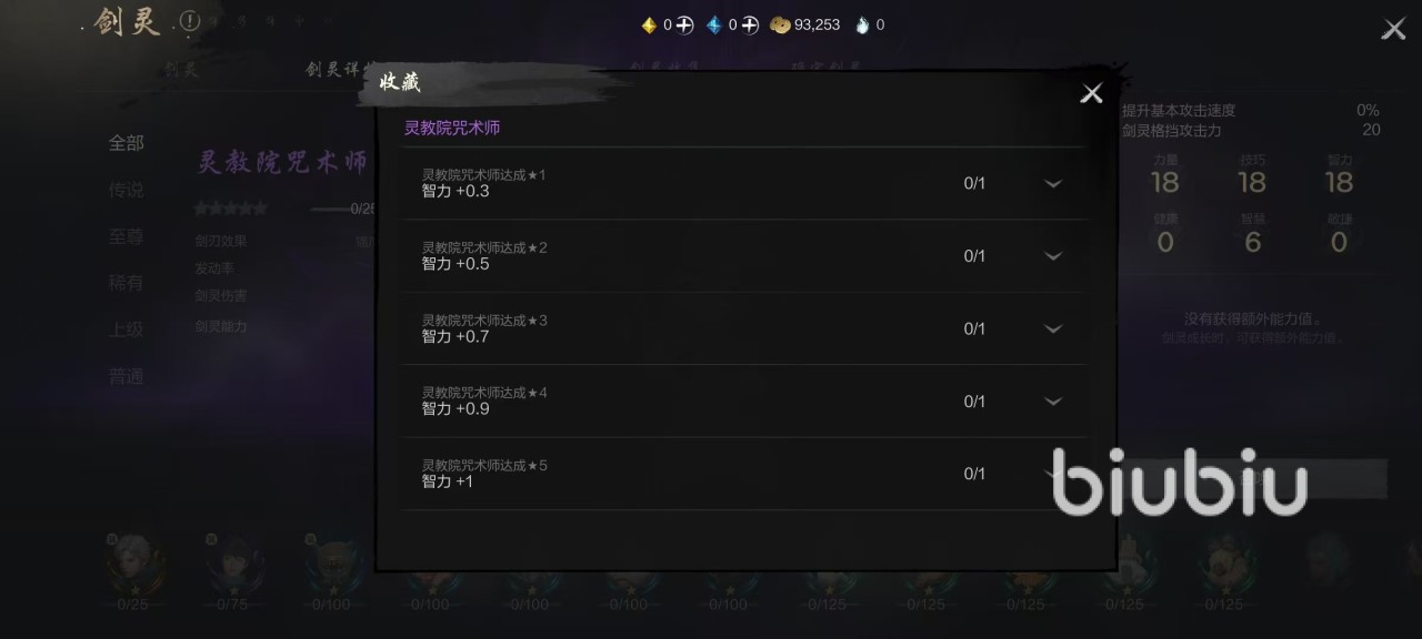 先来看一下灵教院咒术师自身在剑灵效果方面的属性,可以增加20点剑灵格挡攻击力,还有18点力量,18点技巧和18点智力以及6点智慧,并没有其他的额外能力值,这也符合稀有品质的特点。该剑灵也是可以提升星级来增加额外属性,例如升到满星时,无论是攻击力、护身还是贯穿力等都有提升。