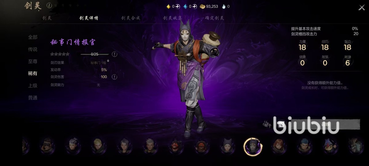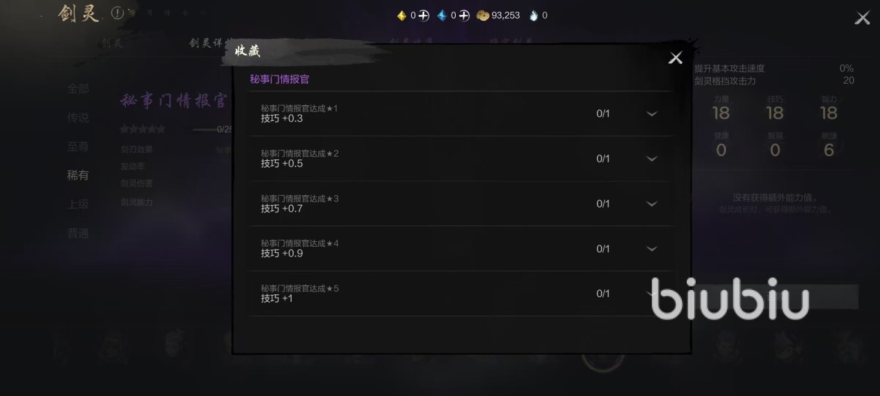 大家在挑选的时候,要结合剑灵所能打出的剑刃效果以及收藏属性和效果属性这三个方面来进行看待。首先秘事门情报官是属于稀有品质,所以在属性方面也符合这一品质特点,它所增加的属性是18点力量,18点技巧和18点智力以及6点敏捷,还有20点剑灵格挡攻击力,没有其他额外能力值,符合自身的特点。
