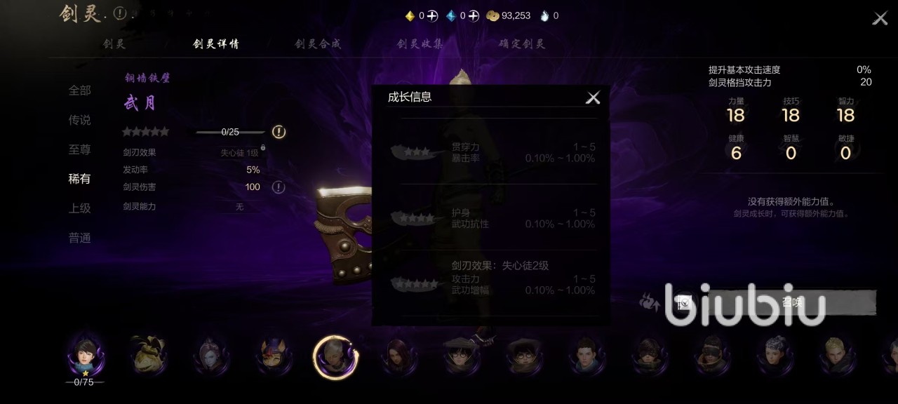 武月在游戏中的称号是铜墙铁壁,这也展现出了它的一些技能特点。在剑灵效果方面,可以提高剑灵格挡攻击力20点,还有18点力量,18点技巧和18点智力,以及6点健康。在初始阶段,没有其他的额外能力值。在成长方面,通过提高星级,防御力、暴击抵抗力、贯穿力等都能获得提升。