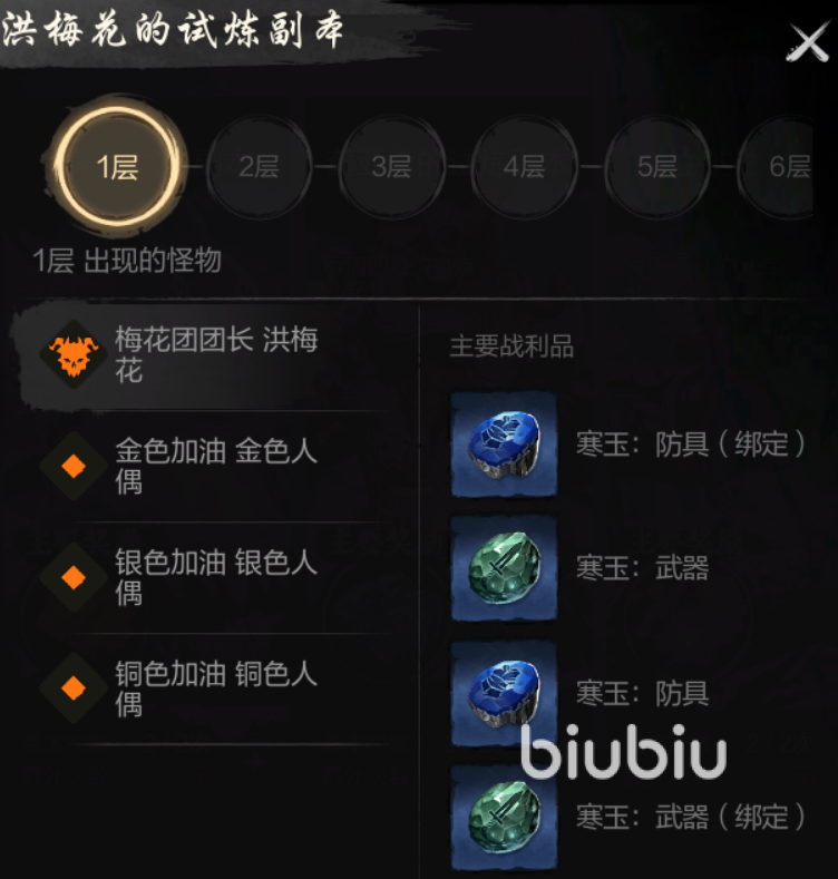 洪梅花年仅二十多岁,就接过父亲重担,执掌梅花团。战斗中,她手持重型武器斧,极具威慑力。她是试炼副本的首领BOSS,击败后,玩家将收获丰厚奖励。其中包括大量用于提升武器与防具的材料道具,如寒玉防具(绑定)、寒玉武器(绑定)、寒玉武器、寒玉防具等。值得一提的是,部分非绑定道具,玩家可挂到交易所售卖,赚取游戏金币。