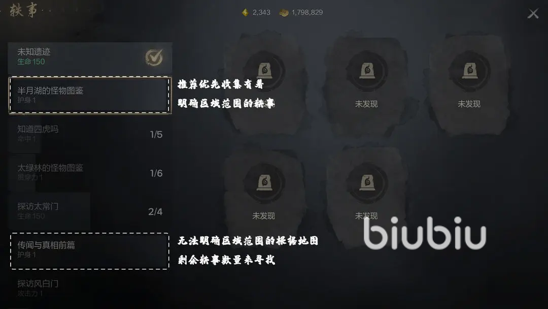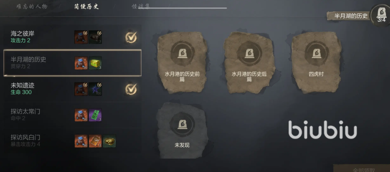 玩法比较简单,就像前言所说,将地图上角落的石碑收集起来,上面可能记录的是游戏里的一些剧情,一般都是明慧团的成员记录的,收集越多的轶事就越能了解到游戏背后的故事,而且收集齐全对应的轶事,就能给人物带来增益,比方说将”未知遗迹“集齐,能让生命值提高150。