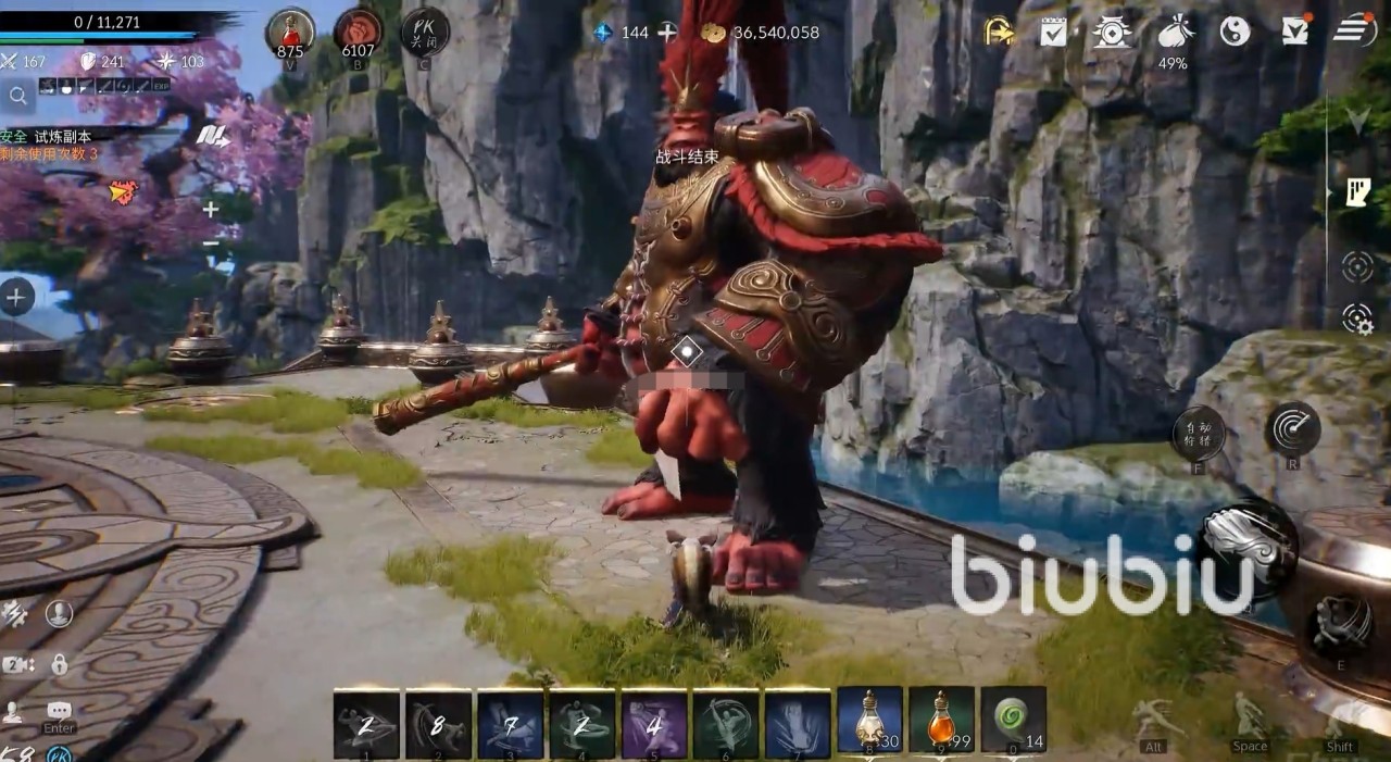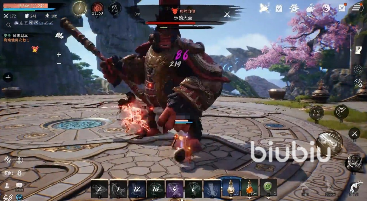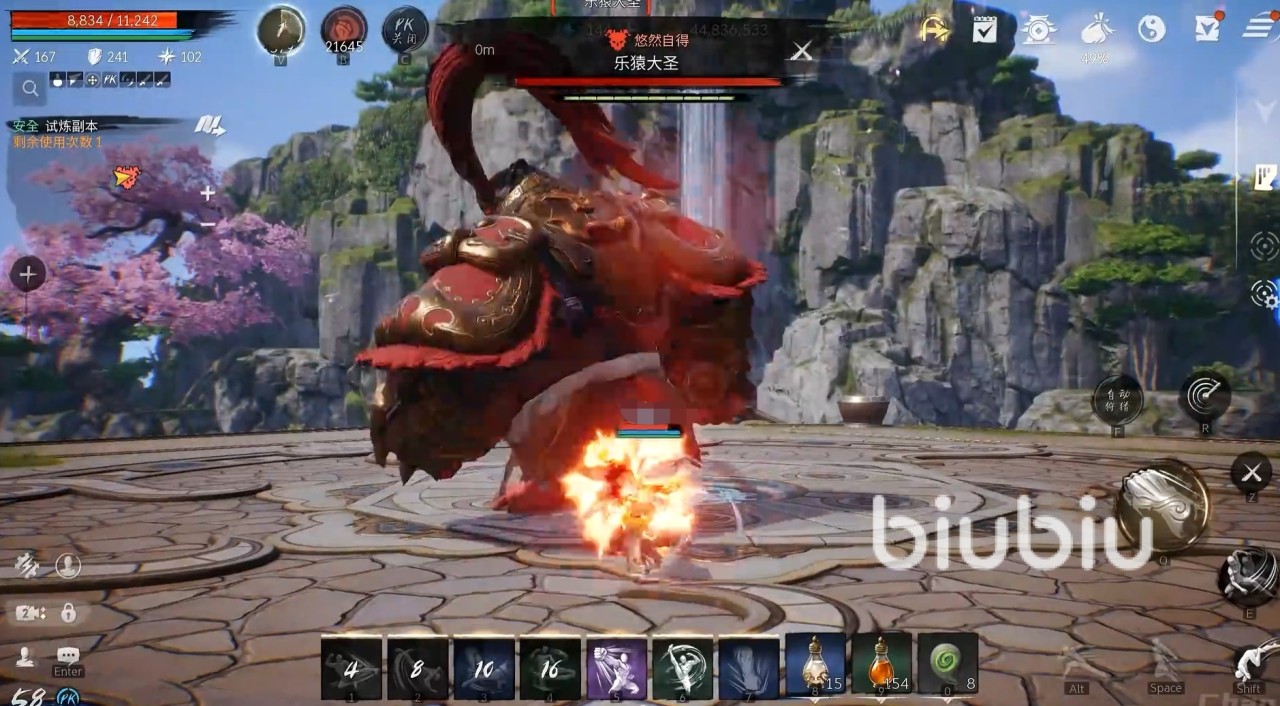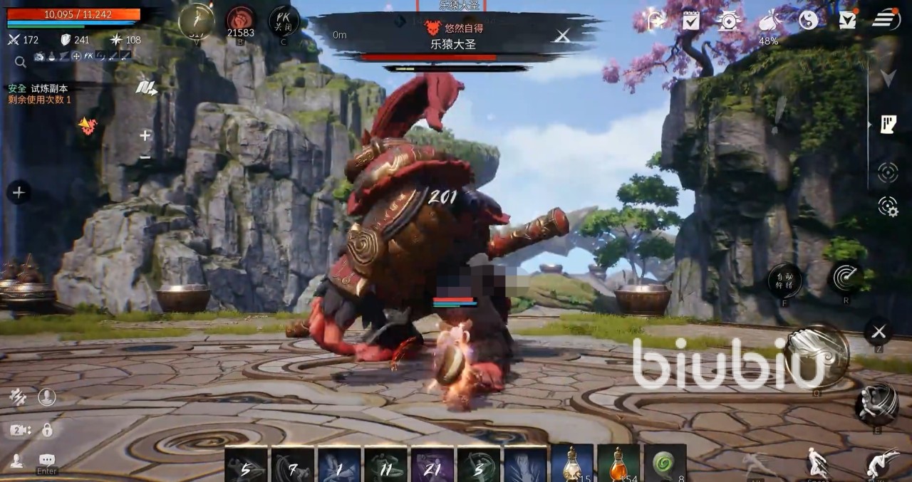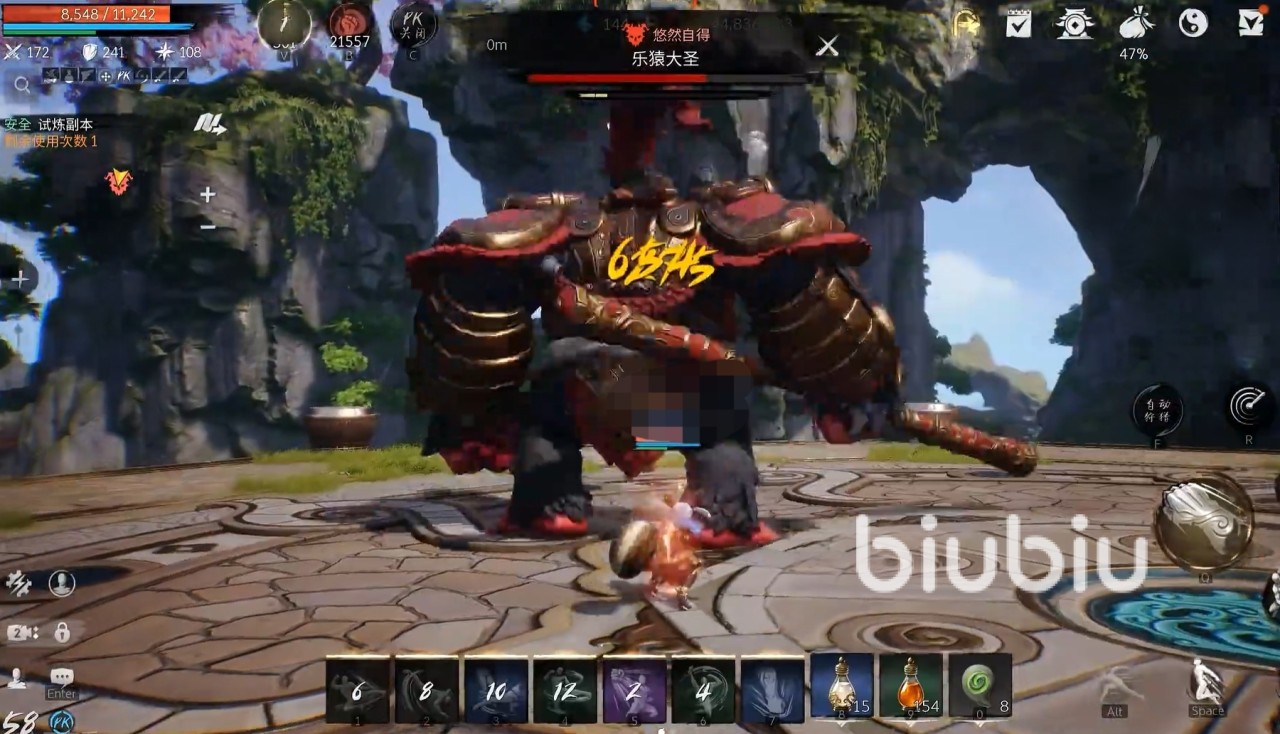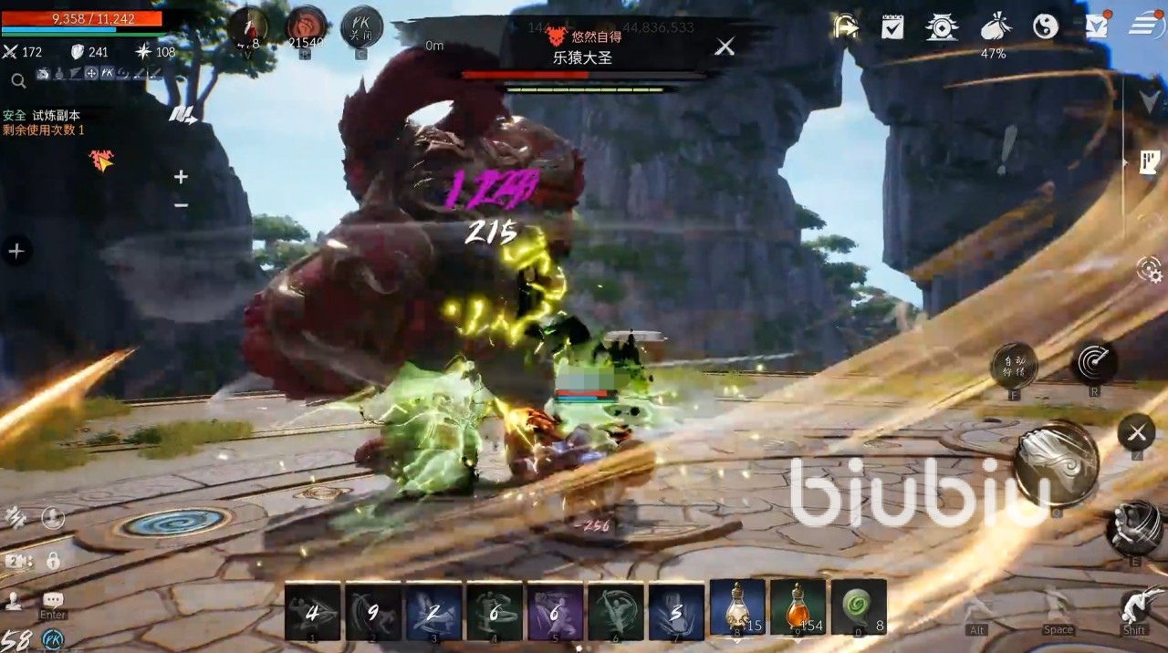 因为它在进行完这一系列的操作后,绿条就会清零,然后乐猿大圣便进入到异常状态,玩家要趁着这一阶段疯狂地攻击它,此时的乐猿大圣是不会反击的,差不多可以在这个阶段中打掉它半管血量。之后就是不断重复,最好可以打出连贯的技能攻击,这样能产生更高的伤害。