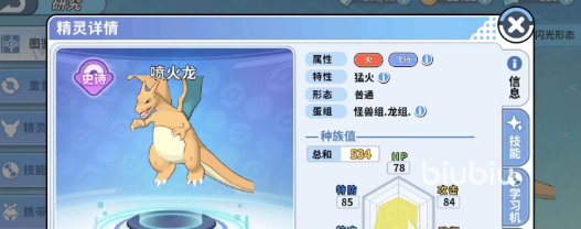 还有火系的精灵,比如喷火龙,这个精灵的种族值也是非常不错的,攻击这些方面都很强,唯一差在血量和防御上面,不过因为很多精灵在速度上也比不过喷火龙,所以也可以进行先手攻击避免收到伤害,同时喷火龙的技能伤害也非常的惊人,在拥有火系技能的同时也拥有其他属性的招式,所以在面对比较克制火系技能的精灵面前也可以打出不小的伤害,同时特攻也非常高,如果可以走这个路线,在对战中的表现应该也会非常的亮眼。