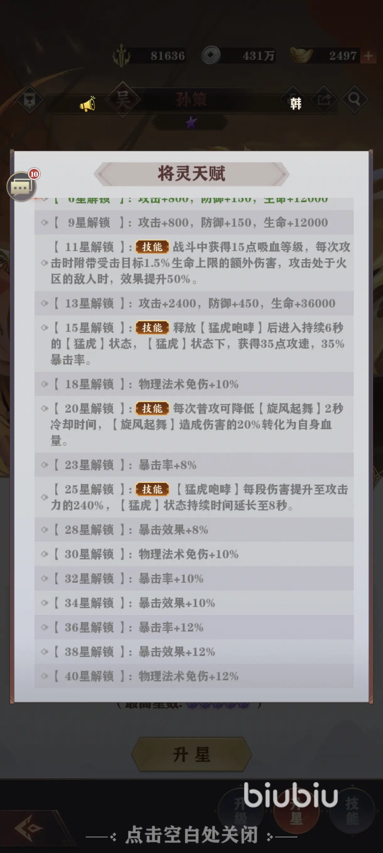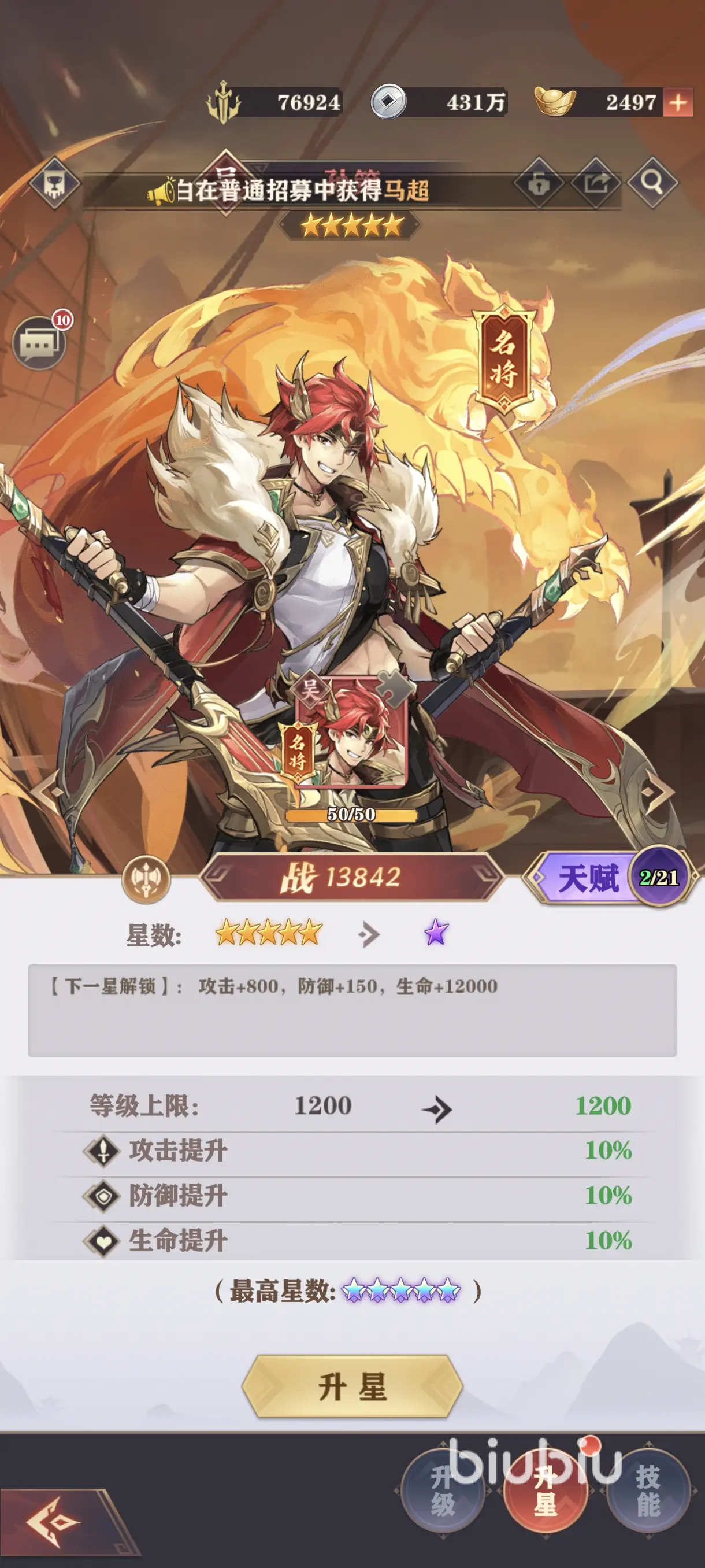 2、养成:目前该游戏一共有52名角色,最高品质是红将,最多上阵5个。角色有升级、升星、装备这三种养成路线,天赋和技能随着星级而自动提升,也算是常规卡牌游戏的养成玩法。