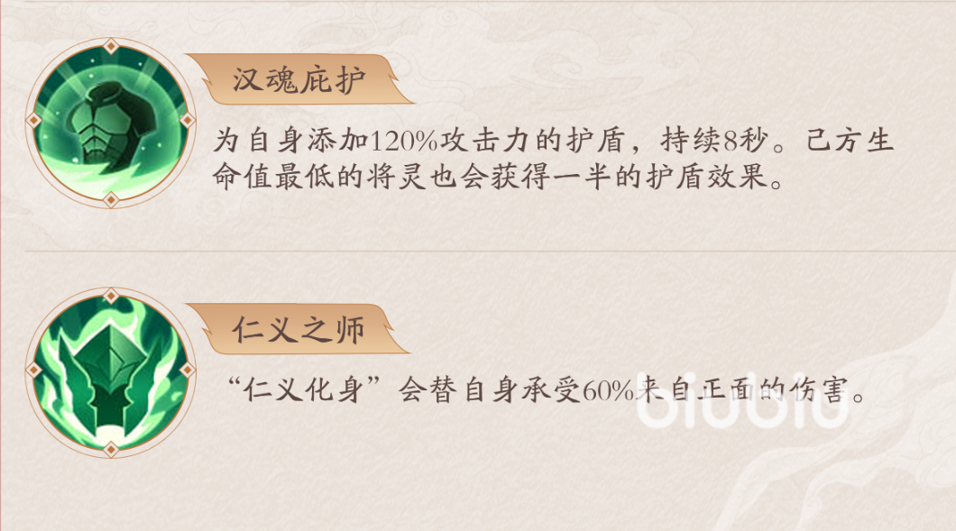 2技能可以对敌方单体造成二段伤害,第二段伤害会附带自己的生命值,也是姜维的主要输出技能,3技能可以为自己提供一层护盾,同时为我方最脆的单位提供一半的护盾,最后一个技能可以帮助我方队友吸收掉正前方百分之60的伤害。