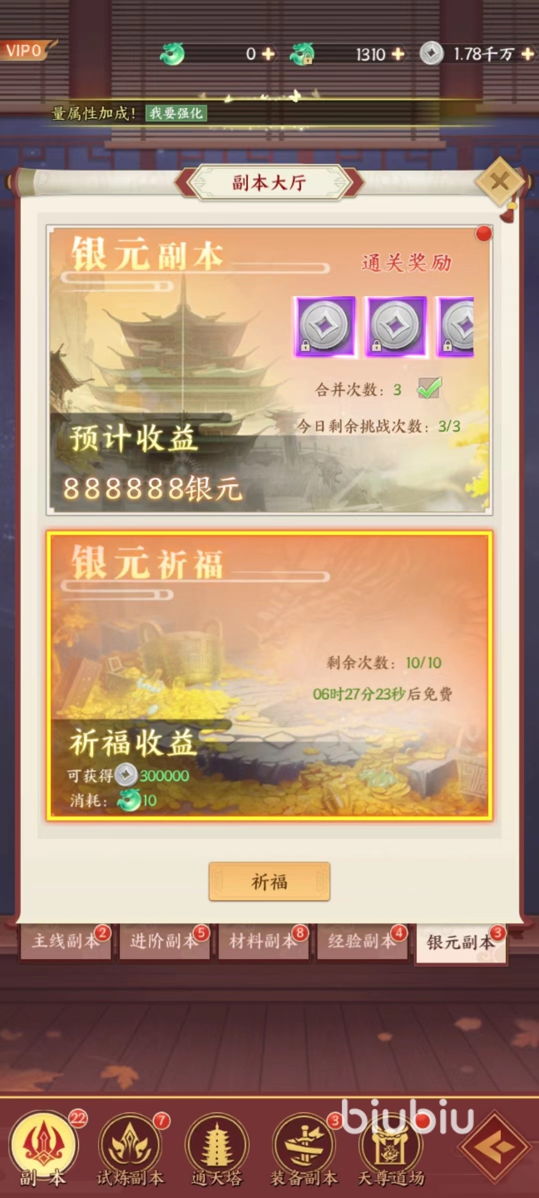其中第1项也是最稳定的获取来源就是挂机战斗,只要处于离线状态就可以自动攻击当前怪物,源源不断获得收益,累积下来绝对是非常可观的。接下来是银元副本和银元祈福,银元副本每天可以挑战三次,玩家等级越高,进入副本难度也就越高,预计收益也就越丰富,可以直接查看到预计收入。还有一项是银元起伏,第1次免费祈福,第2次需要消耗勾玉,也就相当于利用勾玉来兑换银元,每天也有次数限制,最多可以祈福10次,建议大家全部用完。