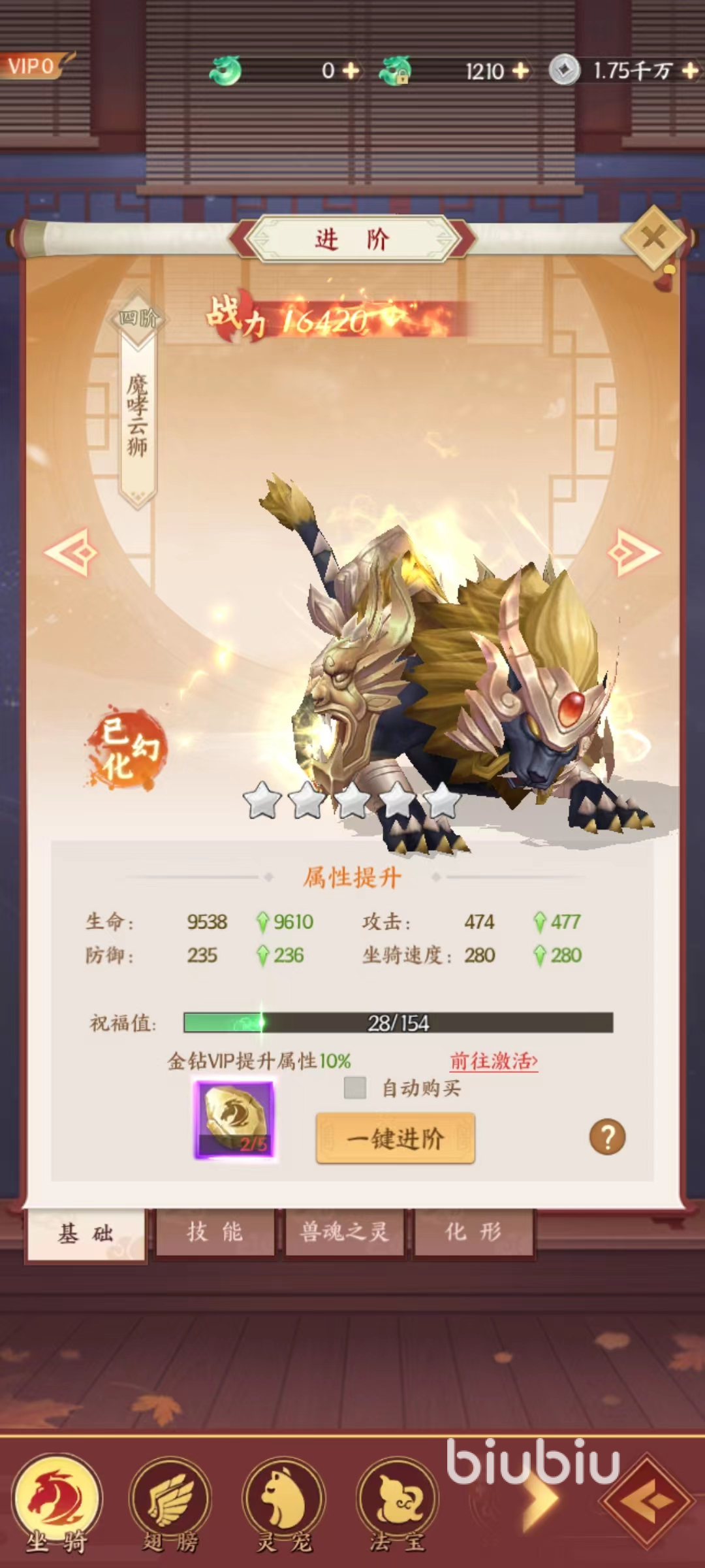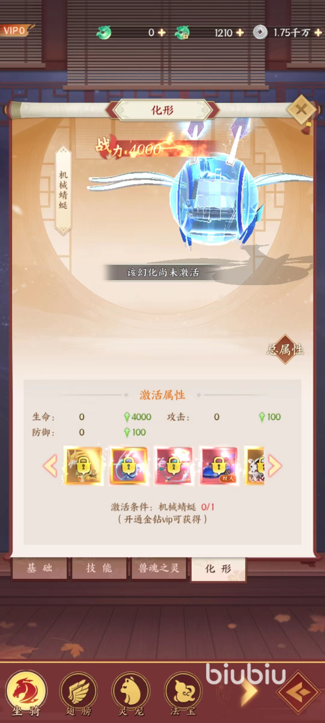 整理完装备之后又来到了进阶功能,分为坐骑、翅膀、灵宠、法宝、魂器、披风、玄臂等这几项内容,虽然加成的属性和具体细节不一样,但是主要强化手法都是进阶,然后再化形,进阶主要消耗各个类型进阶石,通过提升等级来强化基础属性。其中坐骑还有不同技能可以学习,在战斗中发挥作用。化形指的是。各种活动中获取炫酷外形进行幻化,不影响基础等级和技能,不仅外观炫酷了而且附加的属性也更加强力。一旦大家看到这几项内容的幻化非常漂亮,也就意味着土豪玩家。