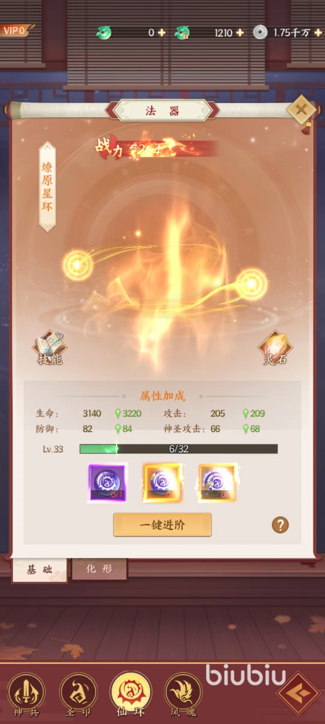 最后是法器,有神兵、仙环、凤魄等不同类型,通过消耗各自精华提升等级,同样可以获取外观进行幻化。在战力加成上比上面所说进阶功能还要高,尤其是后期更是最重要的组成部分。