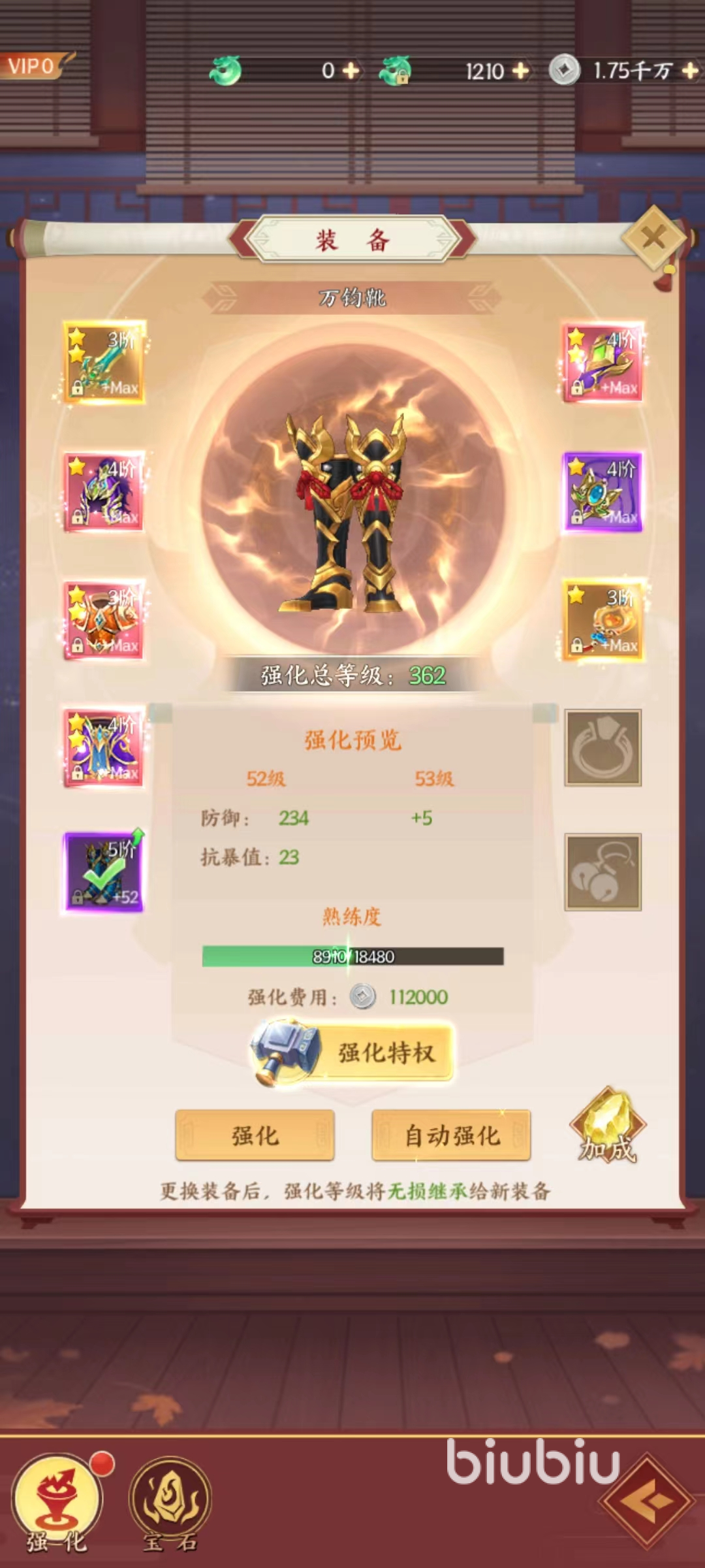 首先要进行的是装备,而装备是一项非常复杂的过程,在初期阶段进行的是装备获取,主要通过击杀各种各样boss和参加难度比较大的活动,或者是去宗门仓库里使用积分兑换。这样集齐一套红色或橙色品质装备后,再进行的就是强化,直接点击自动强化,消耗银币就能自动进行无需操心。这一项完成之后,还可以向装备上镶嵌不同宝石,包括有攻击、防御,生命、闪避等一系列属性,镶嵌完之后再进行升级,这就是前期对装备战力提升最主要的方面。