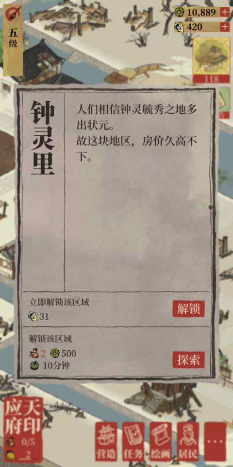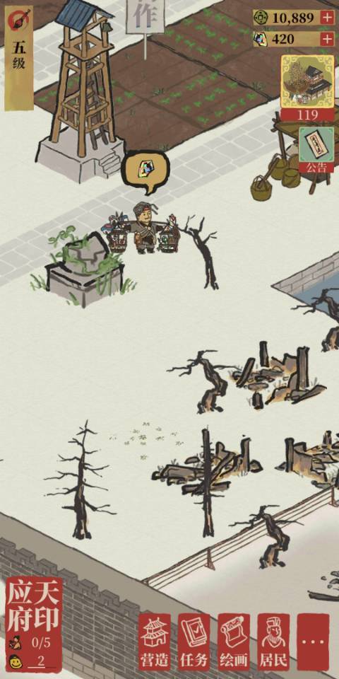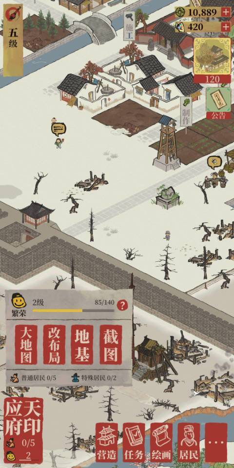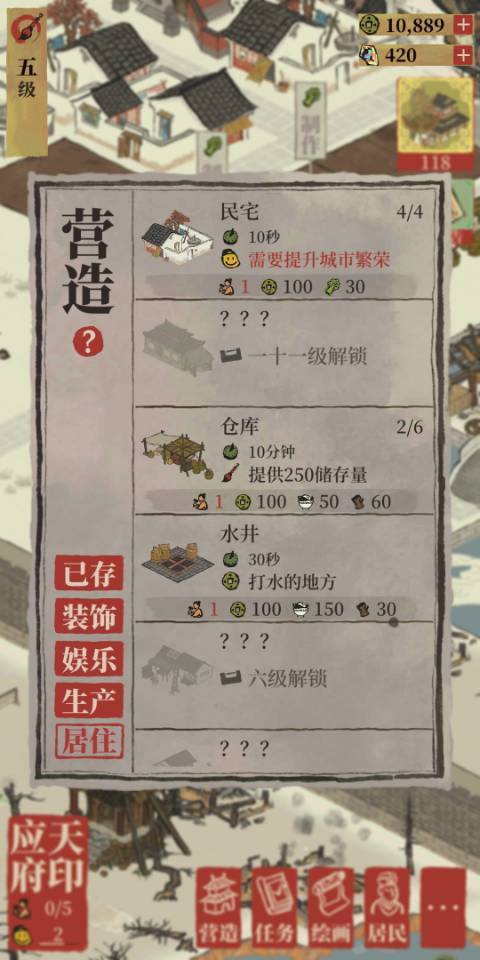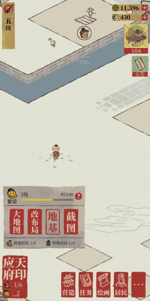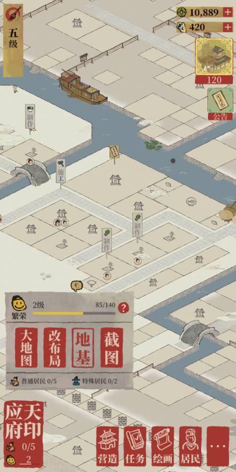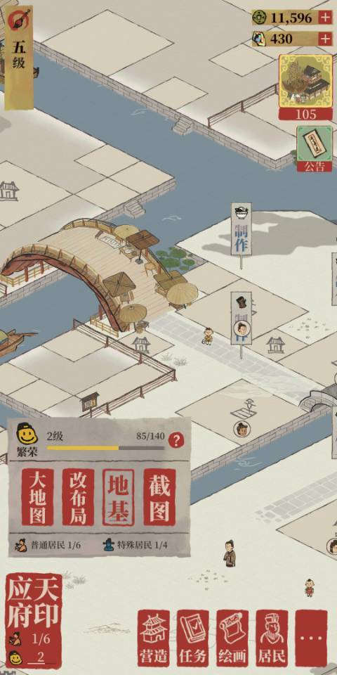 玩家在进入游戏后可点击左下角的“应天府印”来进入城镇详情,随后点击地基即可进入地基模式。在地基模式之下,同类建筑都有着相同的代标:比如生产建筑对应的田地,房屋代表的功能建筑,鱼类代表的渔场等。