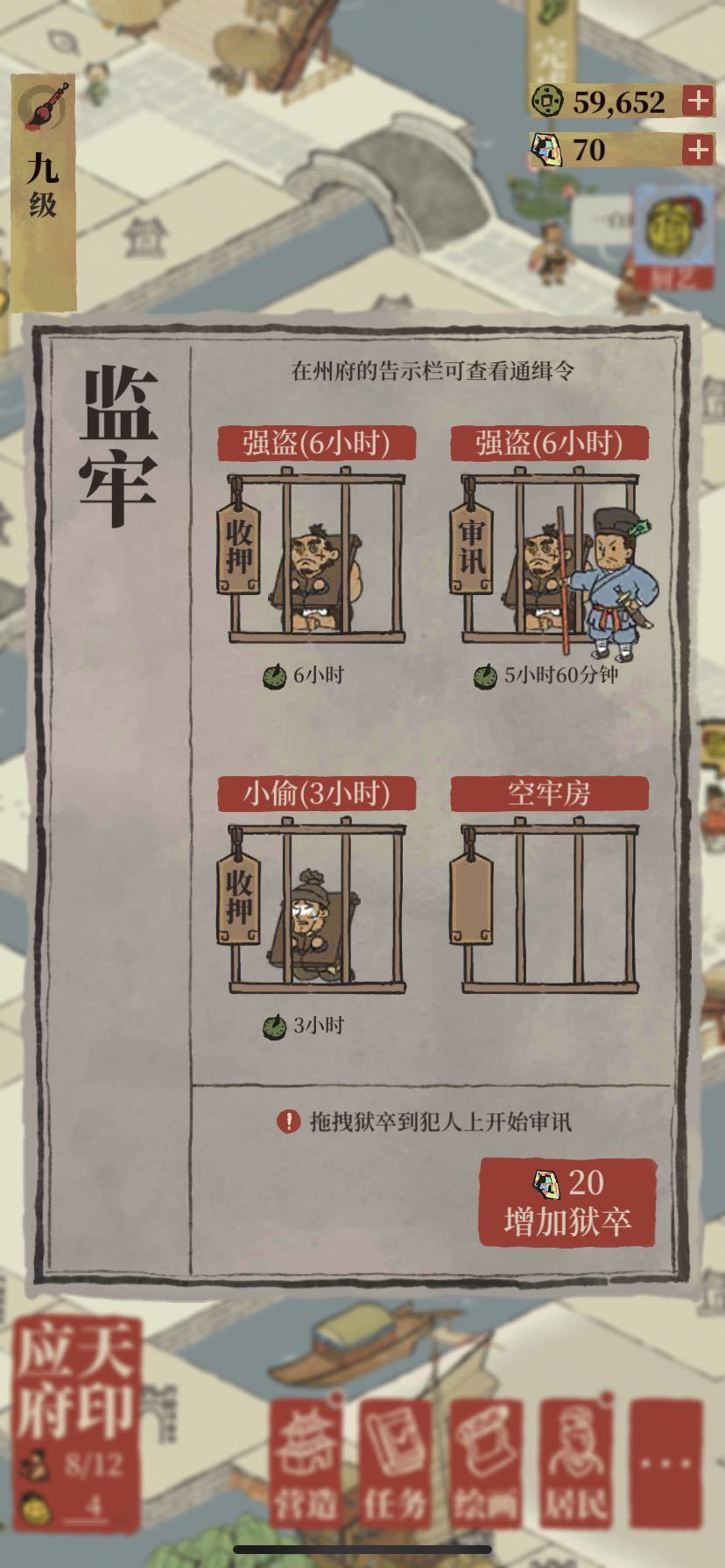 这时,我们需点开游戏右下角的【……】,然后选择【监牢】,进入监牢画面,我们会看到最新逮捕到的盗贼,点击【羁押】按钮,将他送入牢笼之中,然后将画面下方挥着小棒子的狱卒拖拽到关着盗贼的牢房内进行审讯。