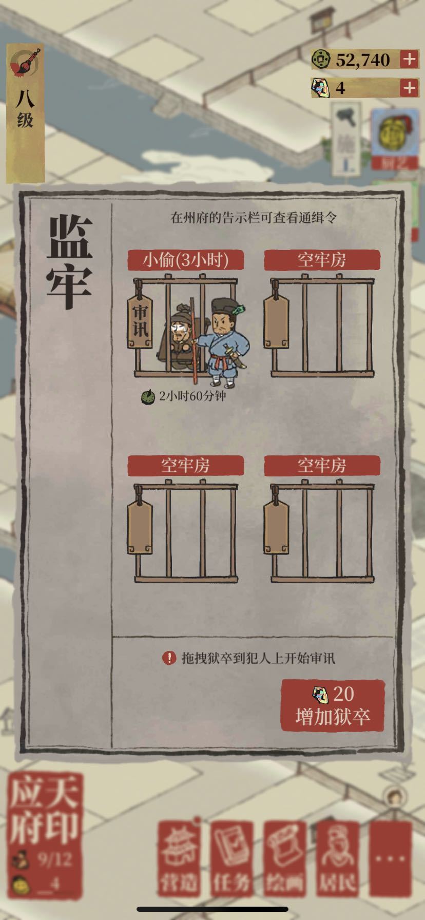 初始狱卒只有一个,如需额外增加狱卒,第一个额外狱卒需要20补天石,第二个额外狱卒需要60补天石,小编就增加了一个,后期对补天石的需求还是满大的,节省点用没毛病,目前,小编一次最多是抓到三个盗贼。