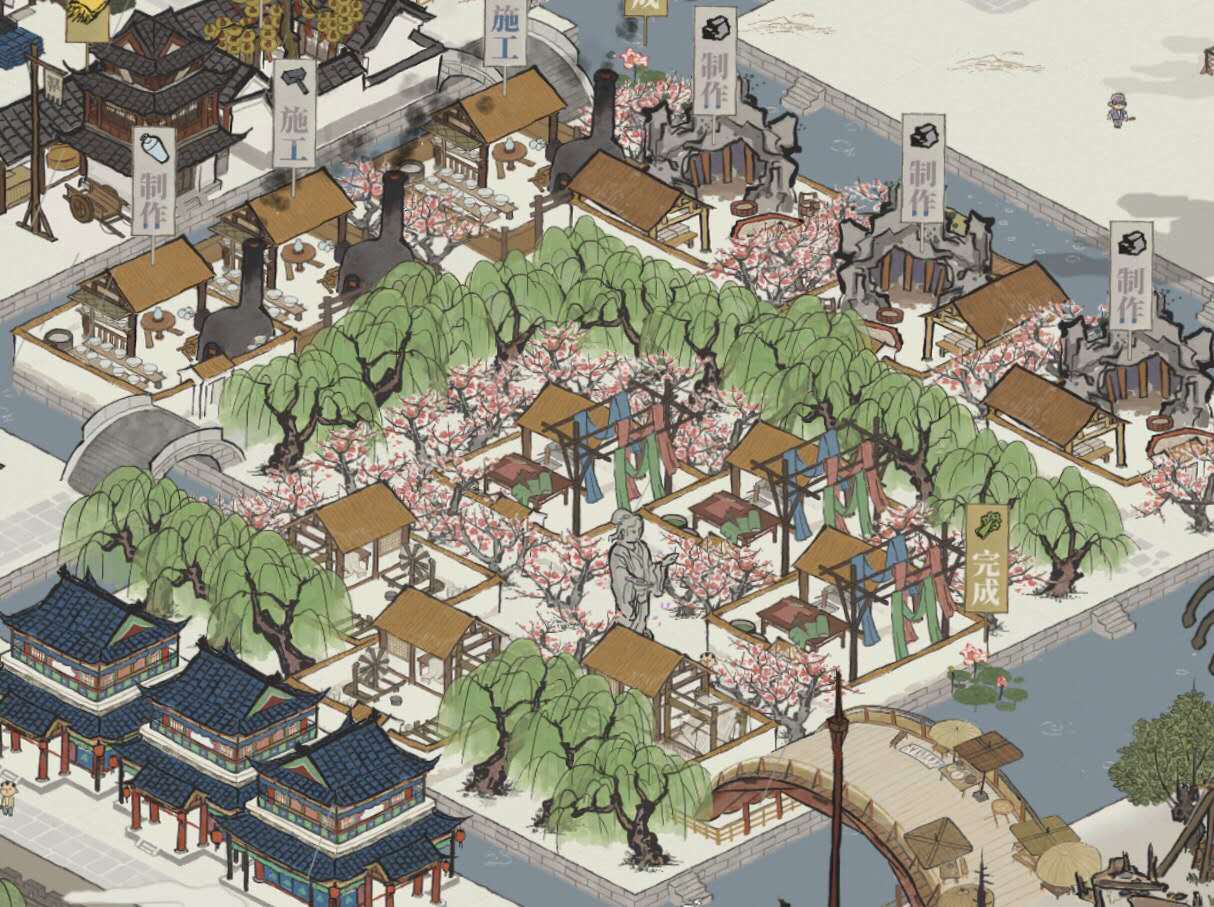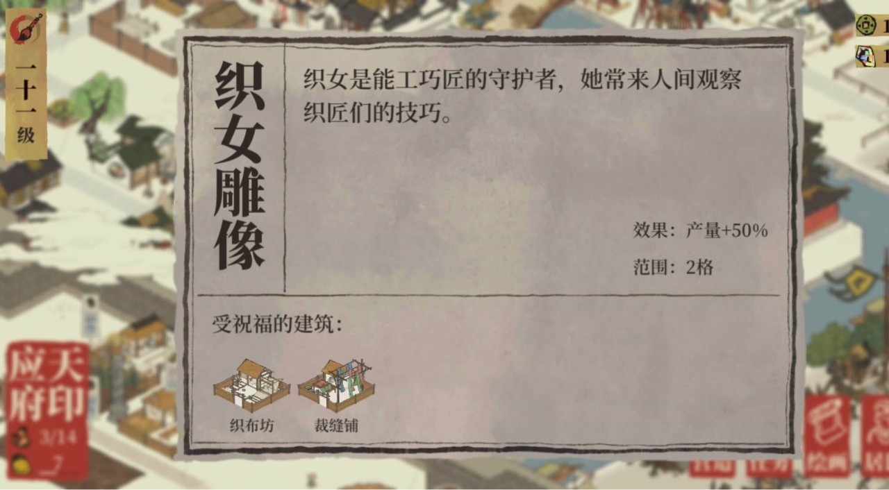 裁缝铺适合安排在应天府城门右侧的织女雕像附近。织女雕像可以让裁缝铺受到祝福,产量增加50%。小编的建议是,玩家在初级阶段各方面资源都缺少时,先建立2至3个裁缝铺,逐渐提升裁缝铺的等级升到四级甚至五级,因为裁缝铺等级越高生产效率越高。前期建造了娱乐建筑之后,成衣需求量会逐步平稳。织女雕像附近的裁缝铺、织布坊的摆放可以参照以下两张图。