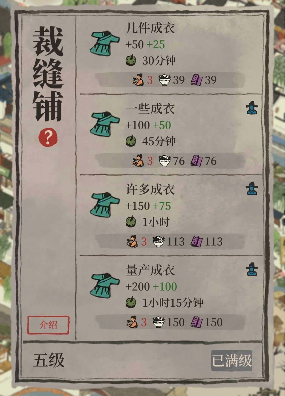 裁缝铺所生产的货物为“成衣”。成衣是西域商贾订单、客栈食客需求订单、建造“琴楼”等建筑物的材料。一级裁缝铺可以生产50件成衣(无加成的情况下),需要3个工人,消耗的资源是39个菜肴、39个布匹。满级裁缝铺可以生产200件成衣(无加成的情况下),需要3个工人,消耗的资源是150个菜肴、150个布匹。