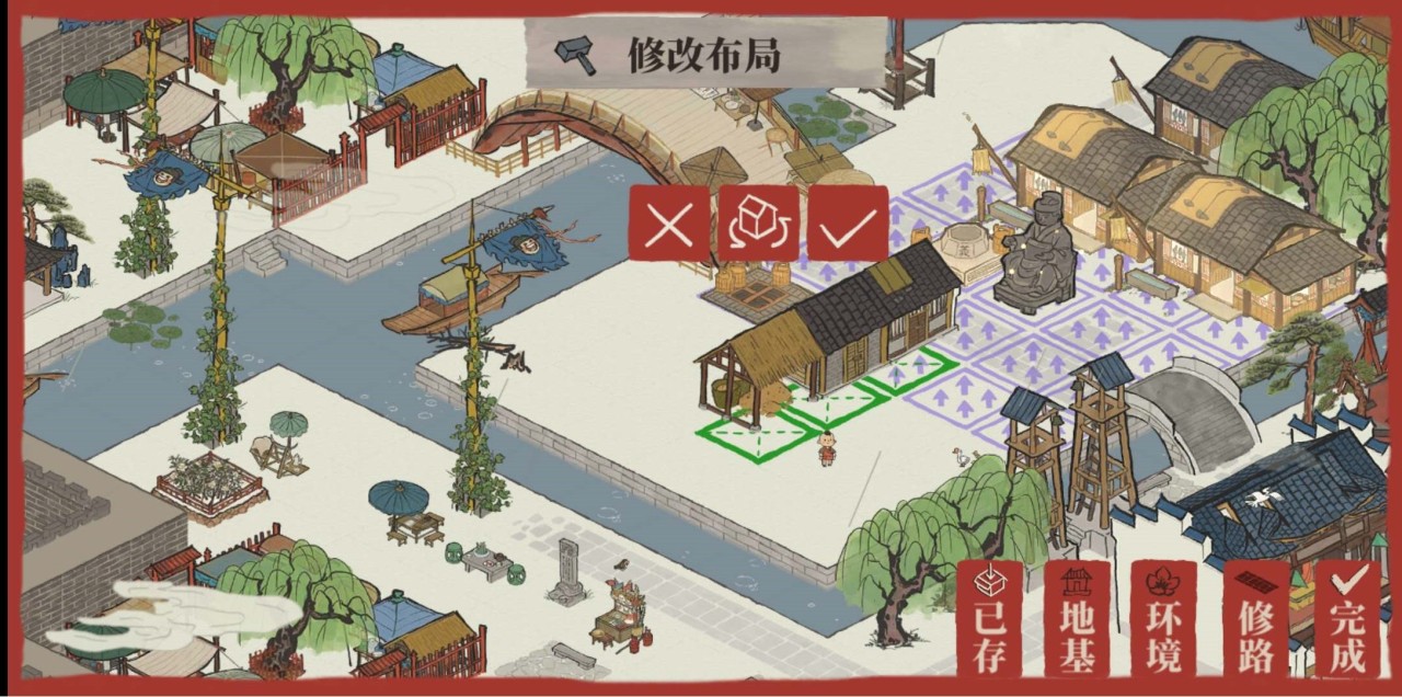 玩家进入修改布局的界面后,可以在当前城市移动建筑。1个仓库共占用1×3个格子,如果格子是绿色,表示可以摆放在此位置;如果格子是红色,表示不可以摆放在此位置,也许是位置不够、或者下方已经摆放别的建筑了。在仓库建筑上方会出现三个按钮,“×”代表退出该建筑修改布局模式,旋转形状的按钮代表把该建筑方向进行90°旋转,“√”代表确认当前布局。