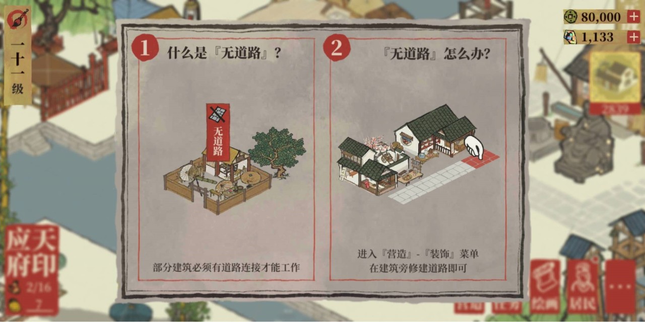 如果摆放仓库的位置没有修好道路,系统会提示“无道路”。仓库需要有道路连接才能工作,玩家需要进入“营造——装饰”的菜单,在仓库旁边修道路,或者重新进入修改布局的界面,也可以新修道路。