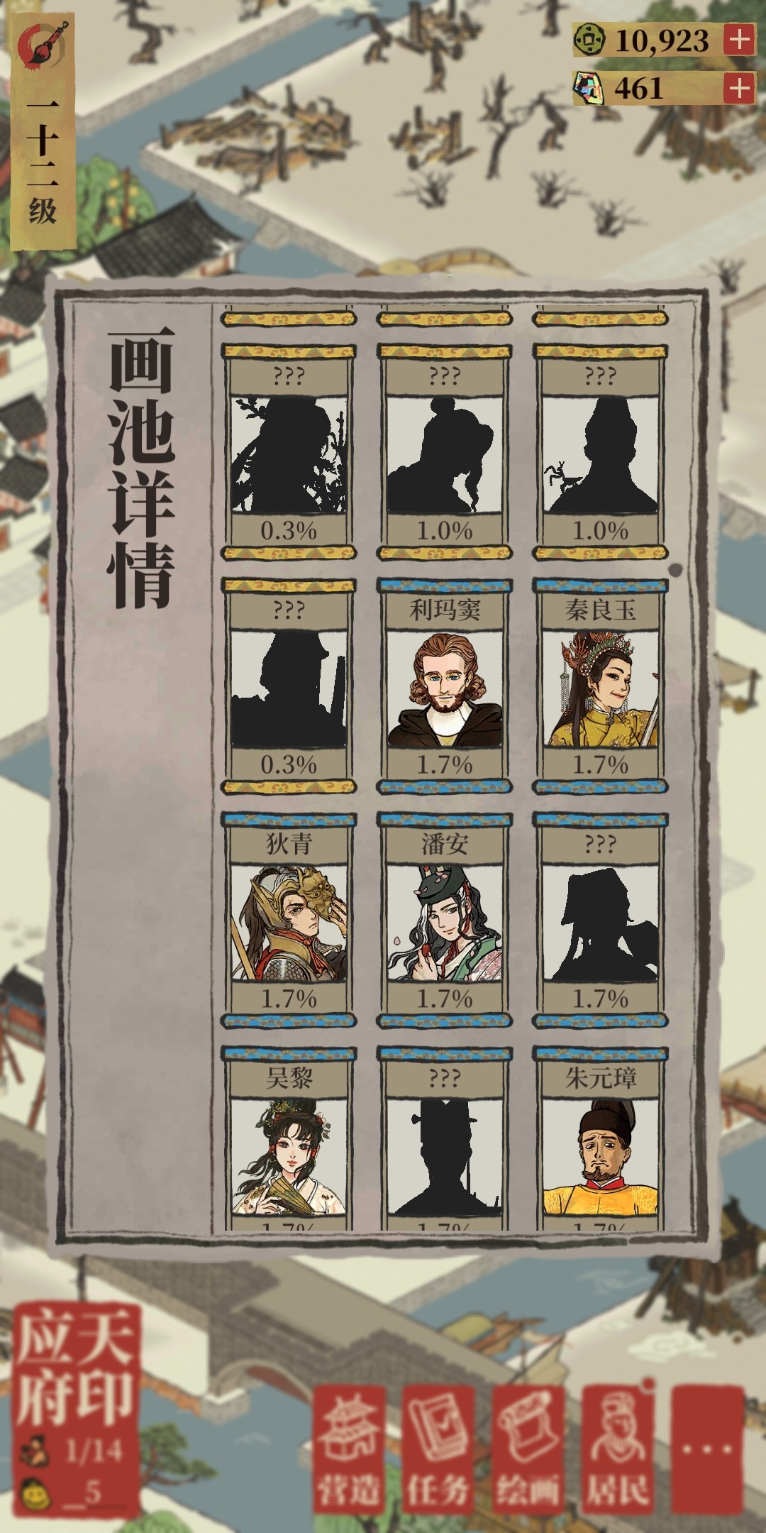 金画轴可以用来抽取固定卡池:精英以及活动卡池:巾帼、珍宝等等,保底机制如下:十连必中至少一名候级以上的角色。通过绘画抽取的人物都属于城市的特殊居民,必须为这些角色配备民宅才能入住,否则角色将处于灰色的无法使用状态。