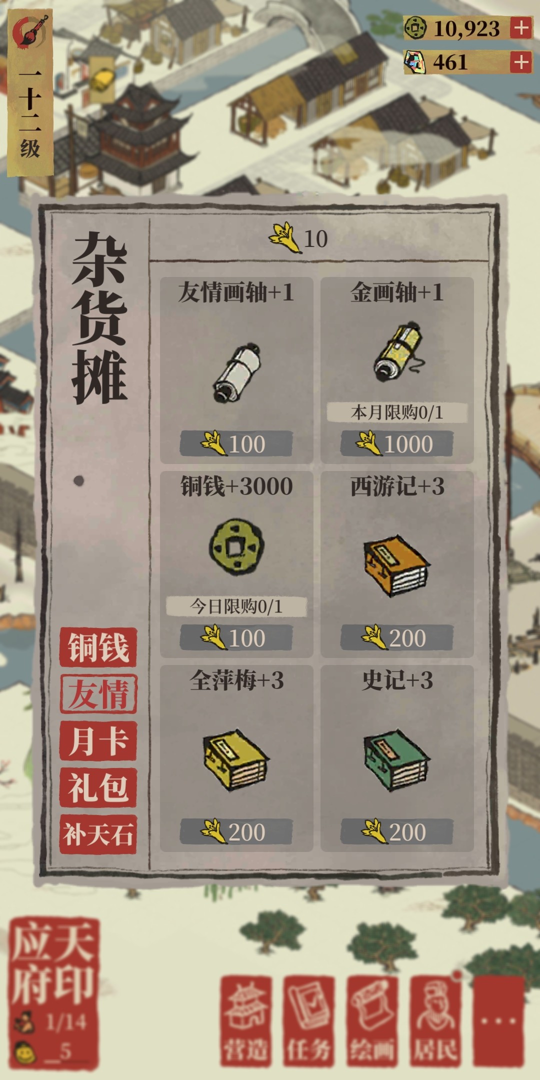 友情点的主要作用就是在杂货摊中兑换商品,其中每月限购的金画轴、每日限购的3000铜钱都是必须要兑换的。如果玩家的好友数量众多,也可以用富余的友情点购买书籍,收集能够增加人物某方面特长,如让人物阅读西游记可增加冒险值,此外书籍没有兑换限制哦!