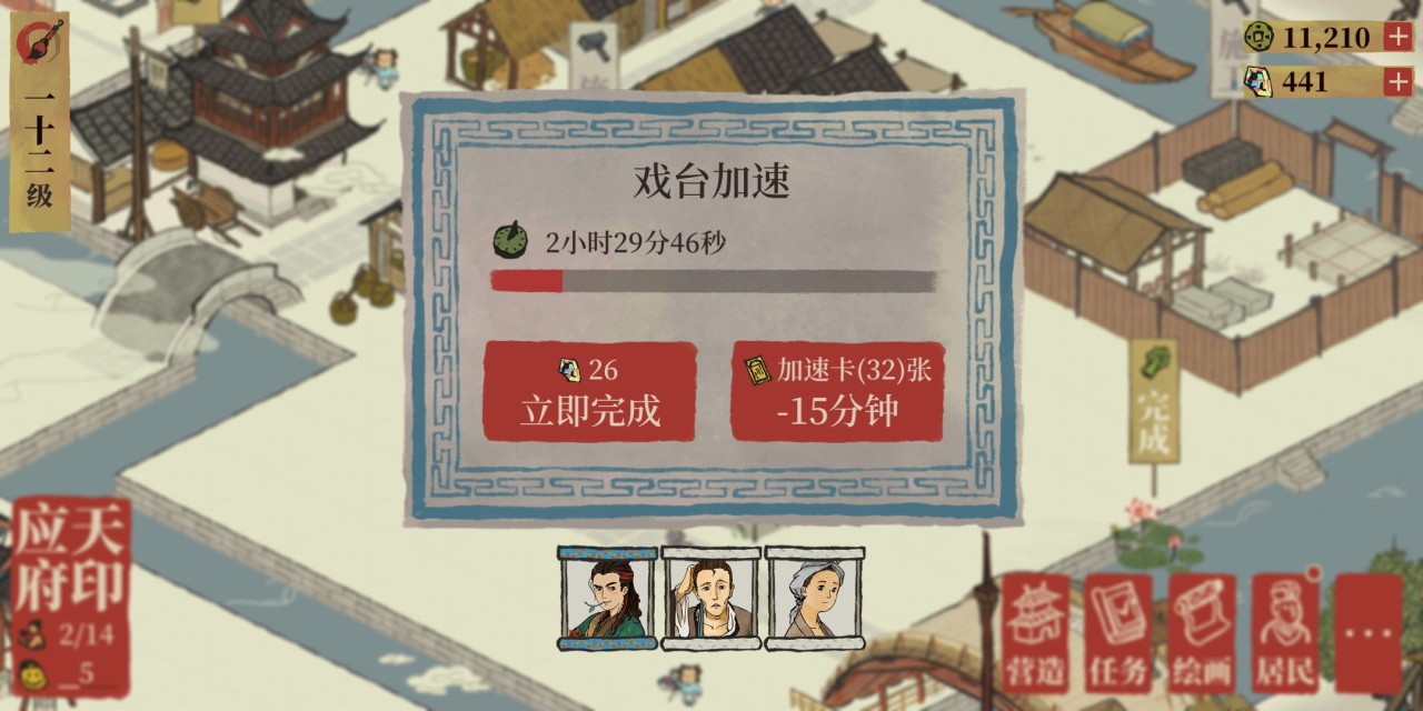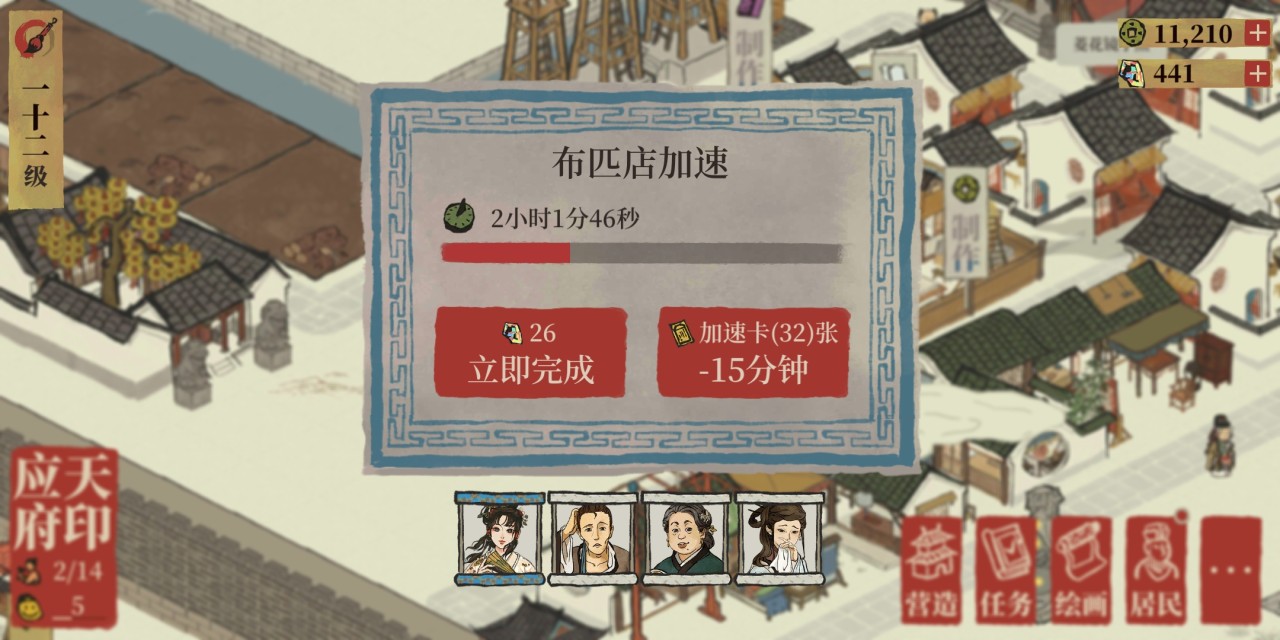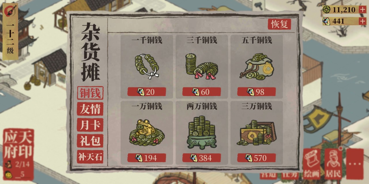 铜钱虽然是免费货币,但日常游玩进程中铜钱的消耗量也是最大的,而布匹店、玩具店等商业建筑赚钱的速度比较慢,一旦突然遇到大额铜钱需求就会措手不及。此时推荐直接用补天时购买铜钱,当然如果只是差一点铜钱就通过签到、友情点购买白嫖啦!