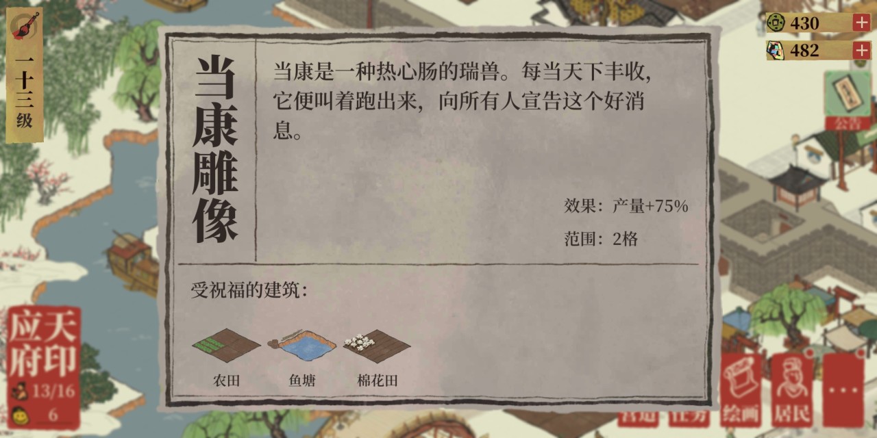 当康雕像的外观形似猪,象征着古代天下丰收的祥瑞,因此效果是增幅附近的农田、鱼塘以及棉花田75%产量。关于以上建筑的布局有一个小技巧:以农田举例,不必完整布置在当康的增幅范围,只需压住边角即可享受增益效果哦!