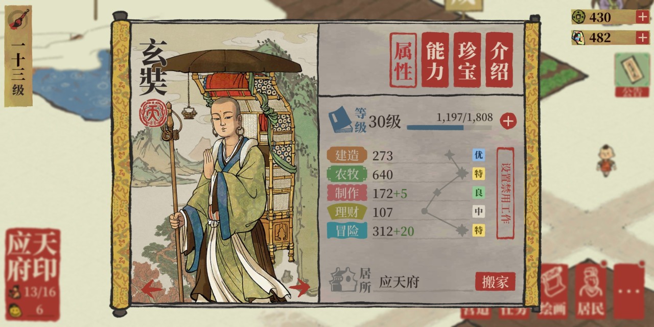 另一个提高农业产量的方法是派遣农牧特长的特殊居民,比如特级农牧的玄奘,初始就能增加30%的农业产量,并且这一增幅会随着人物等级提高逐渐增加。如此,当康雕像、高级农田以及特长居民叠加下来便能最大化农业资源。