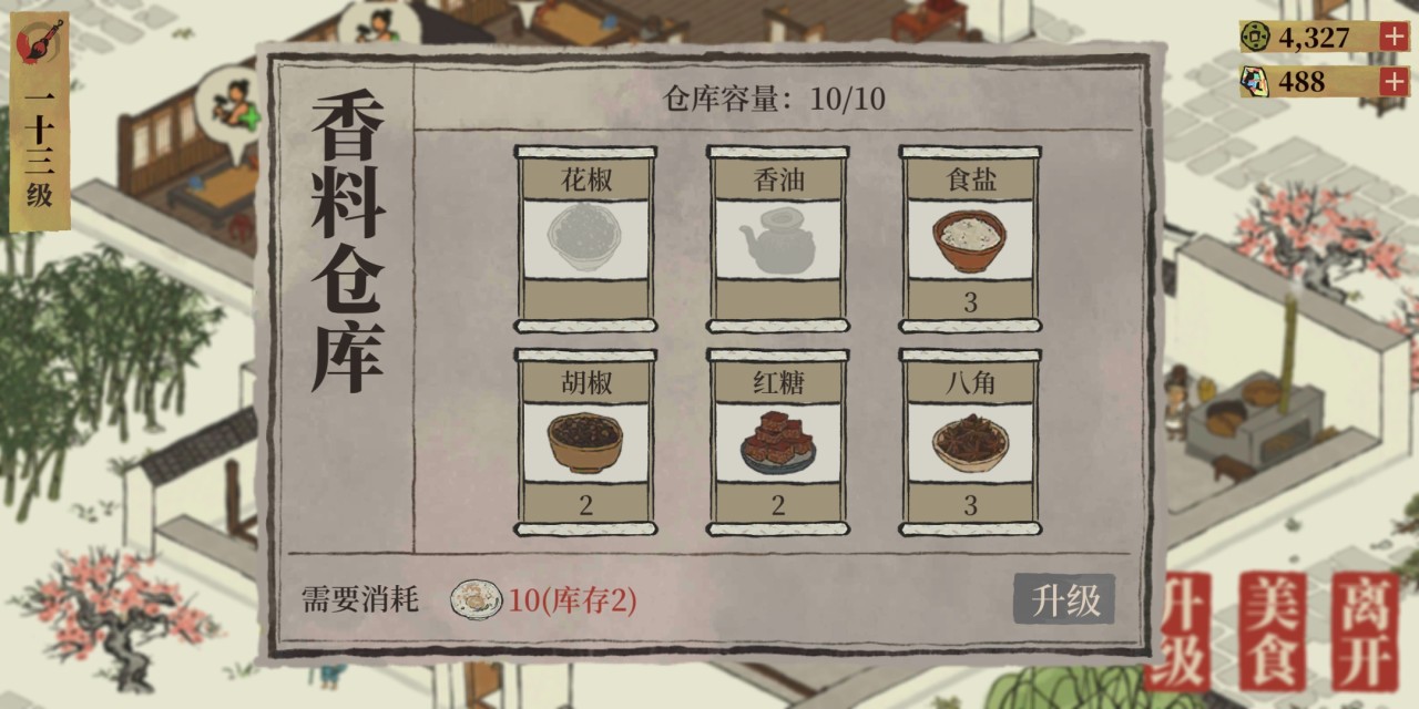 当玩家升到十级后就可以解锁酒馆这一建筑,玩家可在酒馆中研究新菜式、招揽住客作为临时工。餐馆大厅会经常发布居民资源请求,其中就包括成衣,满足请求靠可随机获得香料,能够用来兑换好评空碟给酒馆升级,进而增加税收。