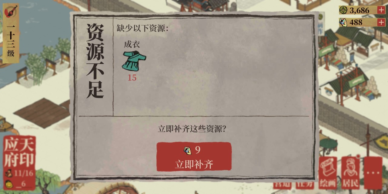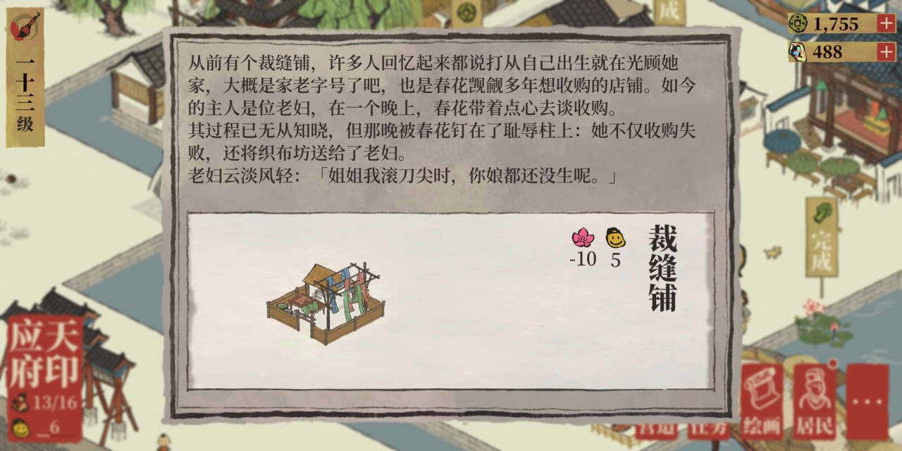 菜肴需要在餐馆中生产,需要使用蔬菜和鱼作为原料;布匹则在织布坊生产,需要消耗菜肴以及棉花。某些特殊居民比如包拯会减少制作成衣的消耗,而文徽明则可以增加成衣的产量,具体增幅数值与人物的制作特长挂钩。制作特长可通过人物升级或佩戴珍宝提高。