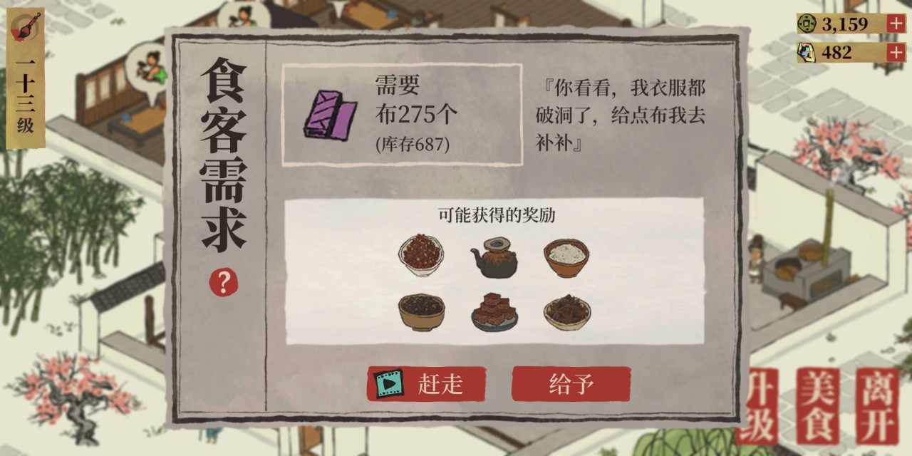 酒馆是玩家重要的铜钱、人力来源,每个小时都会刷新食客需求,其中某些食客,就会索要布匹来缝补衣服。小编不推荐选择赶走,因为如果给予布匹将获得食材,食材能够用来获得好评空碟,是升级酒馆、研究新菜品的关键道具。