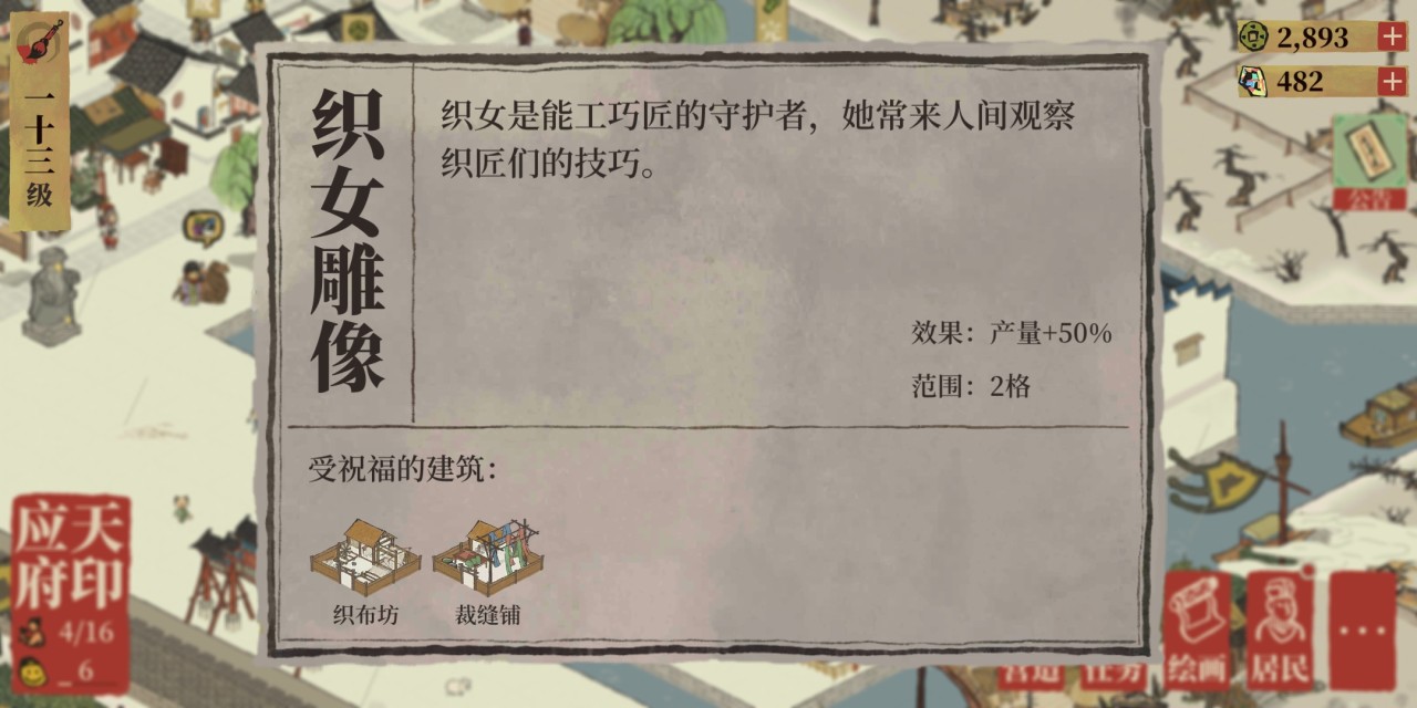 从长远来看,把织布坊布局在织女雕像附近是增加产量的有效办法。织女雕像位于应天府东侧,拥有以下祝福效果:在织布坊、裁缝铺完成工作时,额外增加50%产量,该加成可与特殊居民的增幅效果叠加。