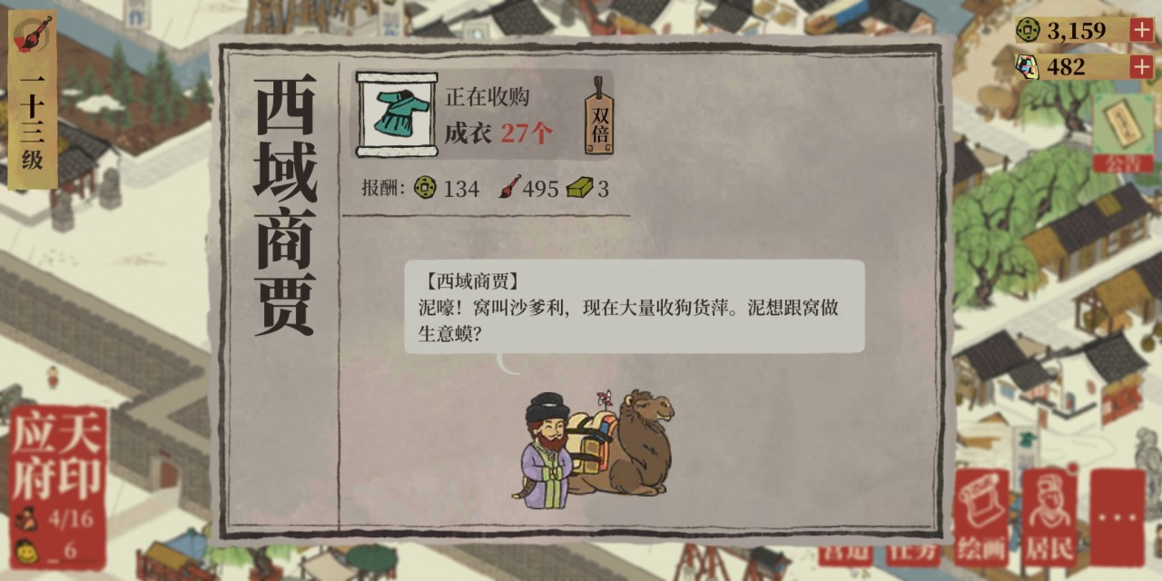 西域商贾是游荡在玩家城市中的特殊人物,每隔一段时间都会发起两次交易请求,包含布匹、成衣等。选择把货物交予商贾可赚取大量铜钱、经验以及金砖,金砖能够用来强化人物珍宝进而增幅基础特长哦!
