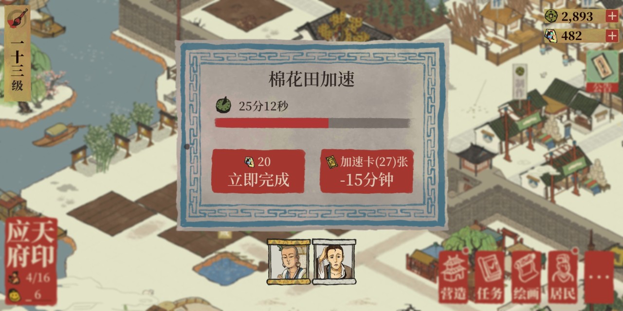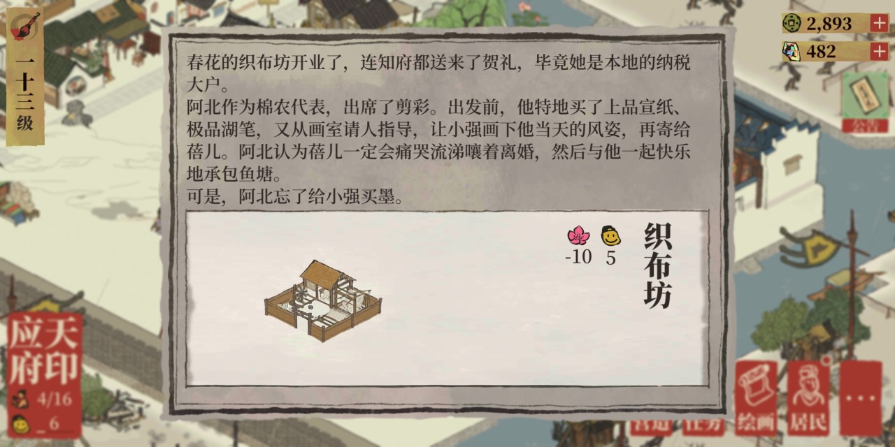织布坊造布匹还需要消耗菜肴和棉花,需要在饭馆中制造或棉花田种植,注意棉花属于经济作物,生产需要消耗一定的铜钱。如果玩家想短期提高布匹的产量,不仅需要准备好足够的原料,还应派出有制作特长的居民,如文徽明、吴黎等。