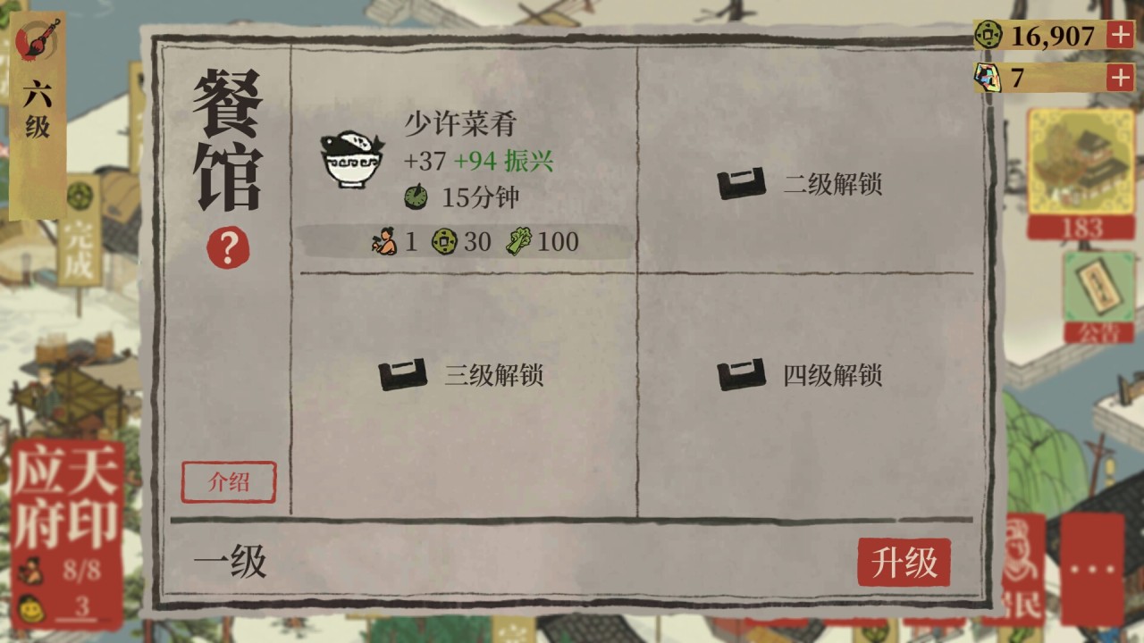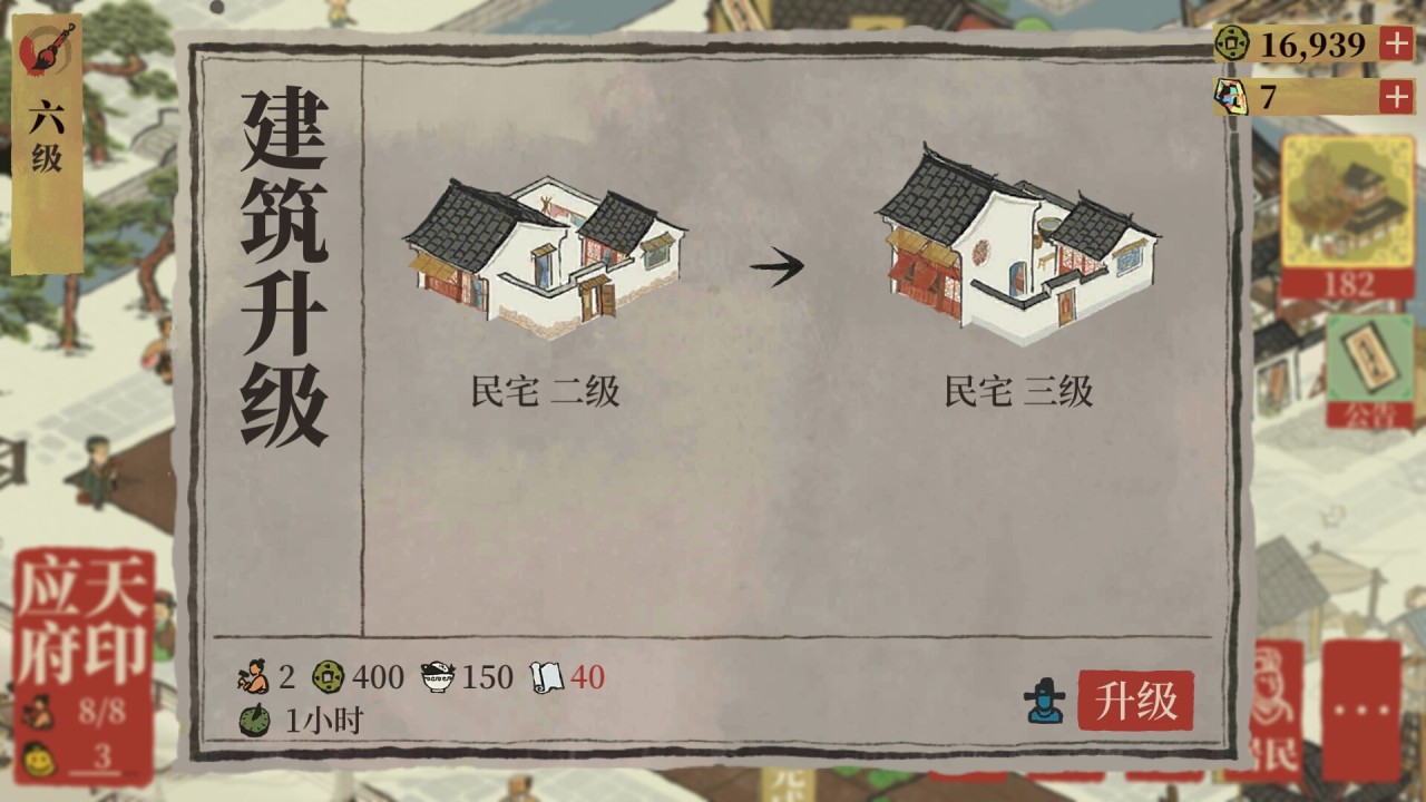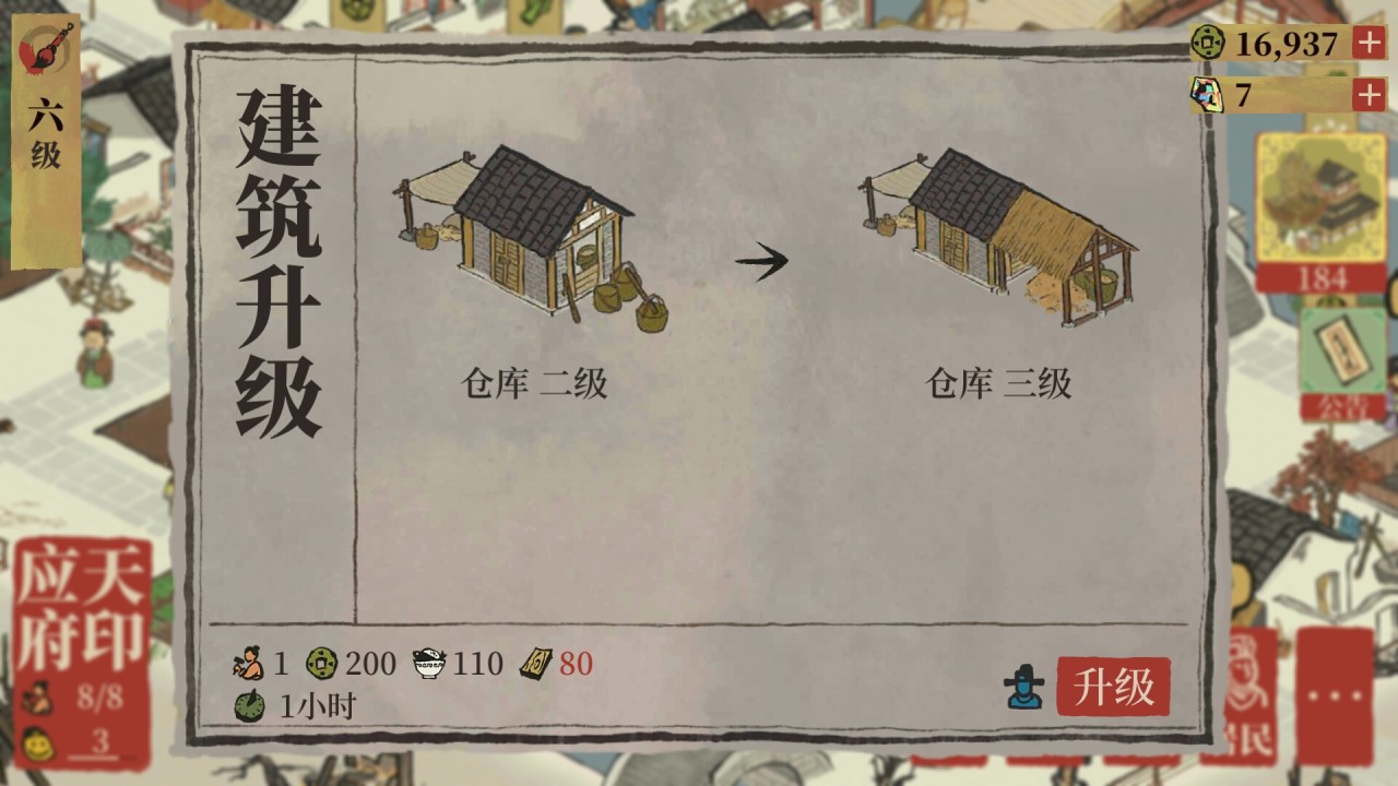 而要提升建筑的等级,可以点开想要升级建筑,点击里面的升级键。当然升级建筑除了需要花费相应的材料资源外,也需要消耗相对应数量的铜钱。