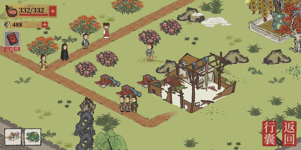 首先玩家需要消耗驿站的粮食储量并派遣特殊居民前往秦淮河畔,这里小编建议选用徐霞客、玄奘等冒险值较高的居民,这样就能够有足够的体力开采更多草绳。完成秦淮河畔的清理废墟任务后,在河北岸就会刷新两处农田,消耗20体力即可获得2~4个草绳。