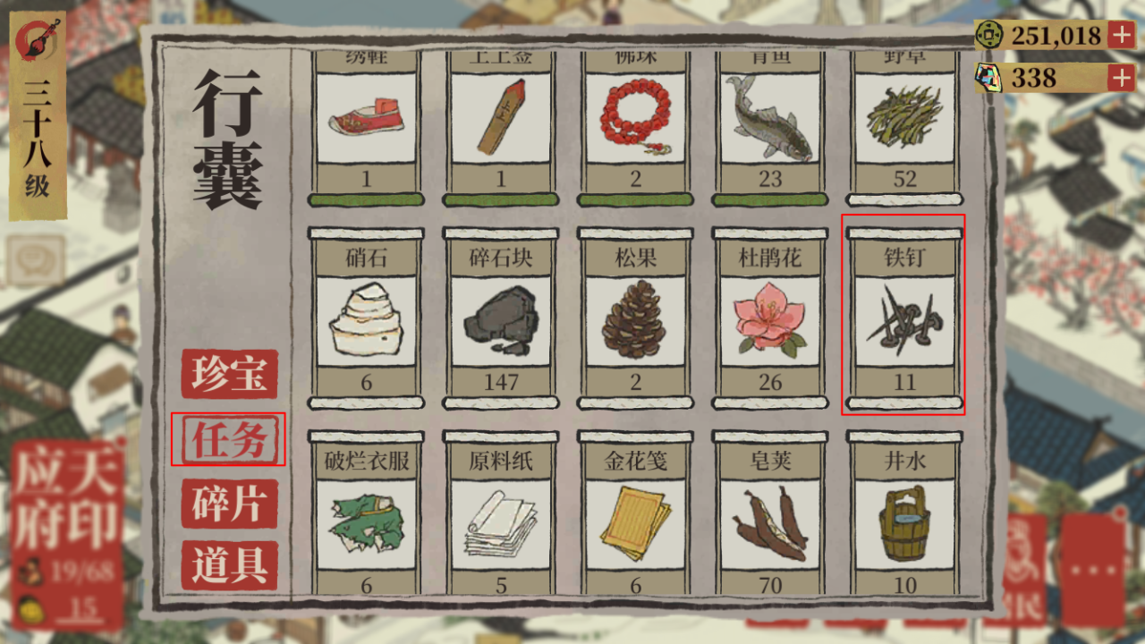 另外,没有用完的铁钉会储存到行囊里,在江南百景图主界面的最右下角,点击三个点——选择“行囊”——“任务”就可以查看。所有在驿站任务中获得的资源,没用完的都会储藏在这里,而且在其他驿站地图中也能使用。比如在秦淮河畔得到的铁钉,可以在应天城郊、丽娘府宅、同乡会馆等驿站地图中使用。