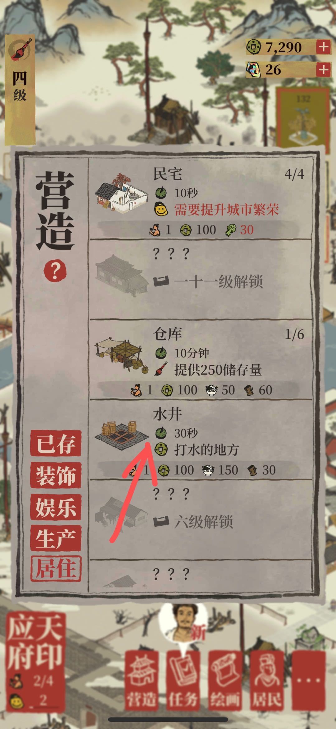 第二步:在营造详情界面左侧的菜单栏选择居住这一大类,在居住的所有建筑中可以看到有水井。点击水井那一列选定它。
