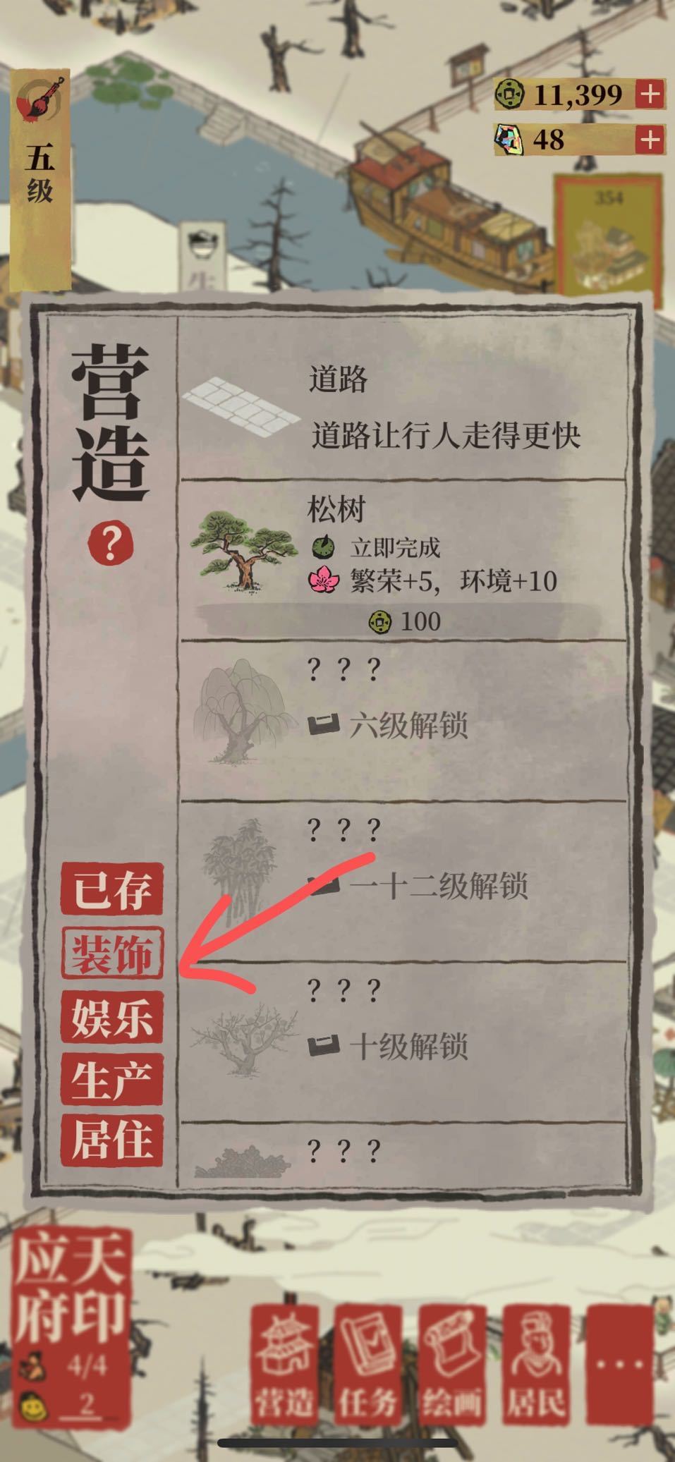 第七步:娱乐建筑建造完成后繁荣度还不够或者想要更多的话,我们可以选择装饰建筑。在营造的界面左侧菜单栏选择【装饰】的类别。