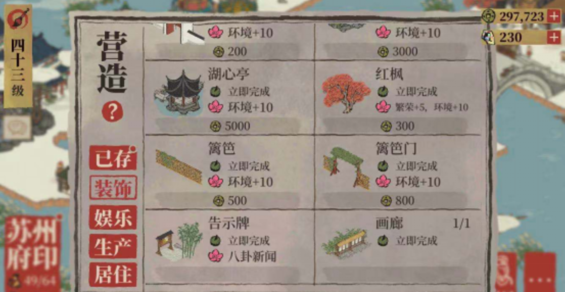 相信各位也发觉了装饰里面的告示栏是不用耗费金币和时间就可以获取的,换言之,游戏玩家能够多购买一些告示栏放到自己的仓库里面,等严大人到府上时就能把这一些通告示栏给他,以换取新的建筑了。在严大人那边用一百五十个告示栏即可换取天级的建筑,所以大家想不花钱就能换到精致的建筑物的话,就赶快去建造告示栏吧!