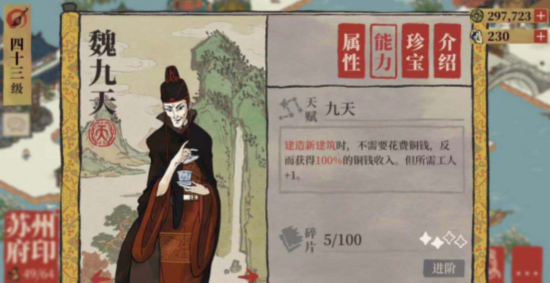 因为这一些房子的价钱都不太高,要用很多个才可以换取到,如果严大人提供的房子是天级的建筑,这类办法就行不通了。最好是手头上有魏九天这个角色,由于魏九天的属性非常特殊,他可以不用花钱建造新的建筑物,并且还能够获取建造新建筑物的等额金币。用魏九天来建多个建筑,不仅能挣到金币,还能够获得新的建筑物。
