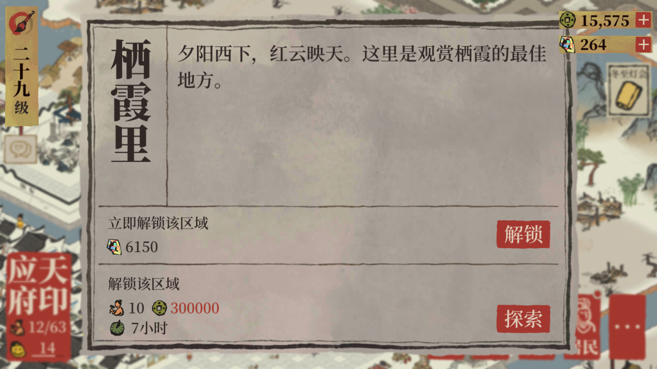 4、当探索新的地域时,会需要若干个空闲工人。比如栖霞里、竹山里都需要十个工人,这时可以派遣空闲居民去解锁该区域。