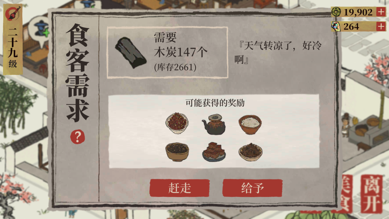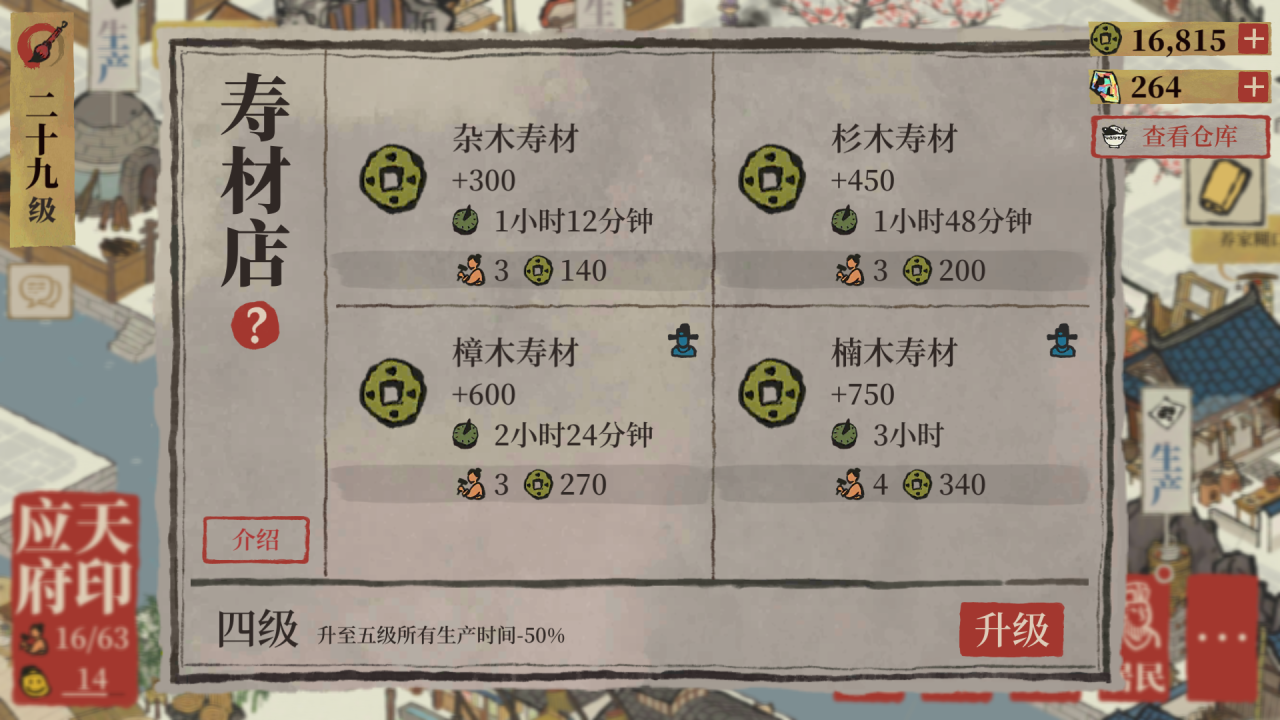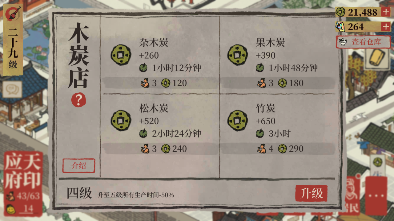 2、理财类店铺等级越高,需要工人数量越多,派遣没有工作的居民,可以减少闲逛人口的数量并获得大量铜钱。成衣店、丝绸店四级时,最多需要三个工人;寿材店四级时,最多需要四个工人并且有一个是特殊居民;木炭店四级时,最多需要四个工人。