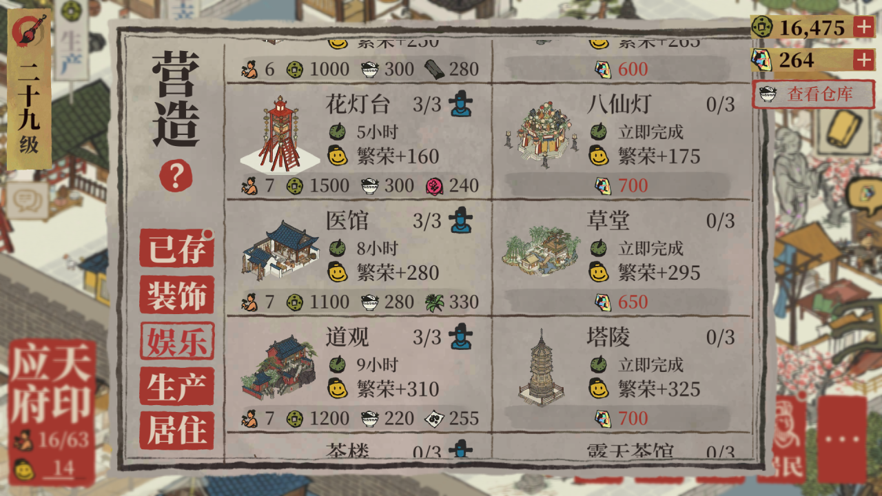 3、与严大人交换东西时,可以交换娱乐类建筑,之后再重新建造该建筑。花灯台、医馆、道观的建造都需要七个工人。