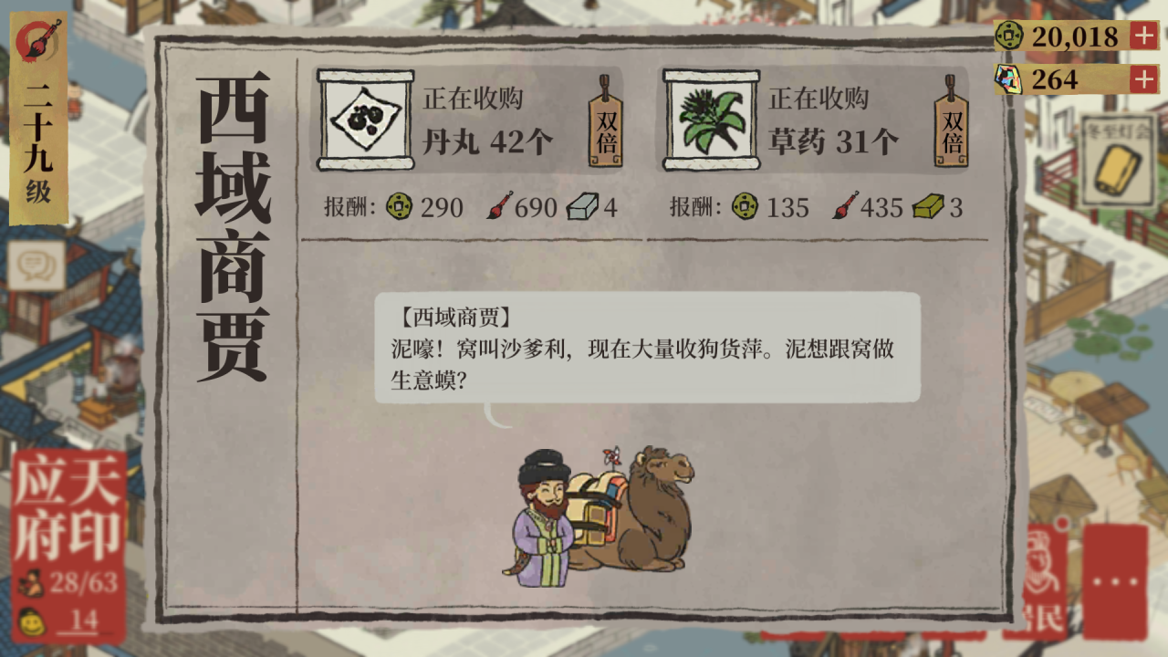 1、生产类店铺等级越高,需要工人数量越多,派遣没有工作的居民,可以减少闲逛人口的数量并获得资源。烧炭厂、瓷窑四级时,最多需要四个工人。当生产材料过多时,可以运往另一个城市;或者在客栈中用材料兑换香料,获得铜钱收益;或者用材料与西域商贾交换,获得铜钱、经验等报酬。