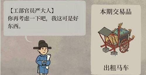 玩家在游戏中兑换出租马车的第一个途径,就是和工部官员严大人进行交换,每隔一段时间,严大人就会出现,如果在交换物品当中,有出租马车就可以获得这项物品了。