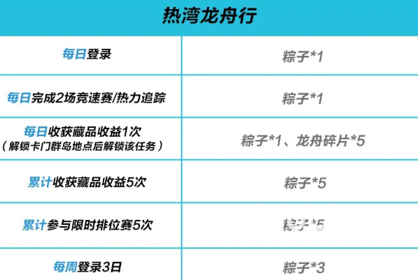 首先是热湾龙舟行活动,时间从5月31日开始到6月19日结束,在这个期间每天都会给大家发布,例如每日登录、参与5次排位赛等等小任务,只要完成相应的任务就能获取到龙舟碎片和粽子。