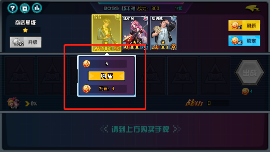 (4)若你的【战牌币】不足,但商店中有希望购买的战牌时,可以点击“锁定”,在进入下一轮的准备阶段时,保留锁定的战牌。