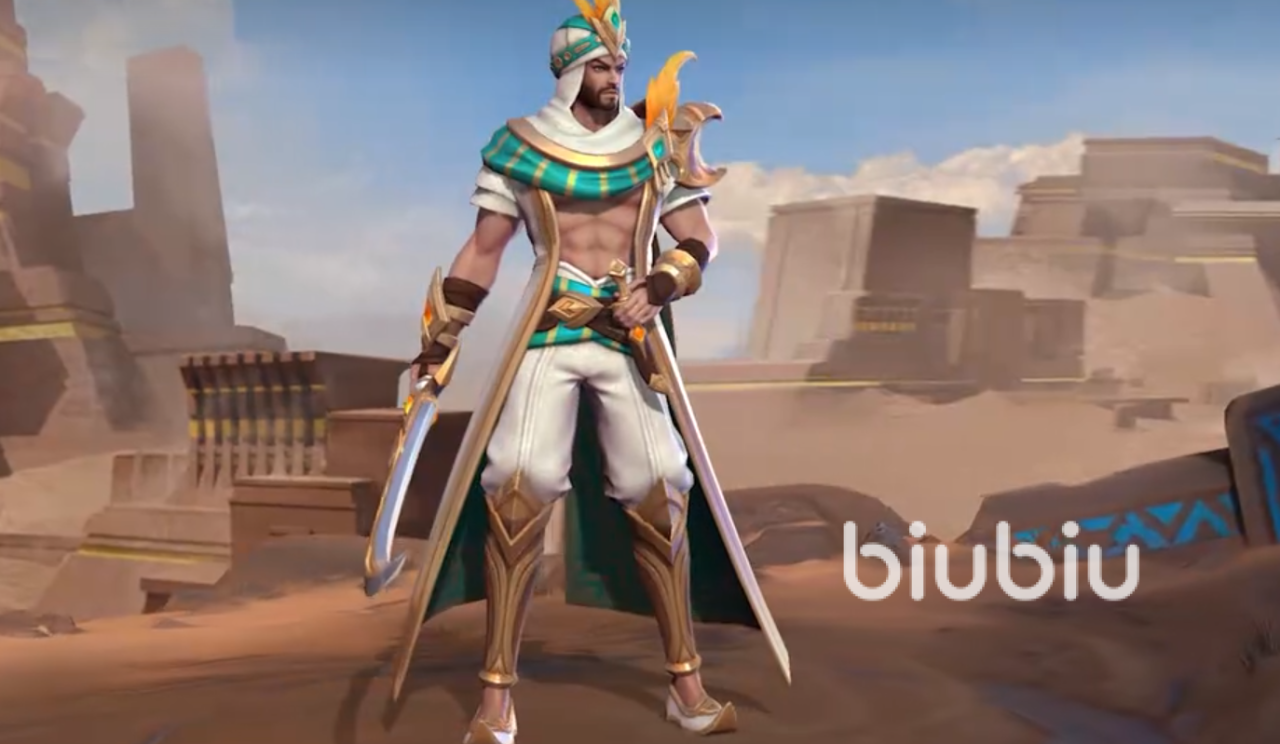 他的一技能“沙漠飓风”会旋转起手中的沙刃,对周围的敌人造成物理伤害,并将目标向自己的方向拖拽,在技能持续期间,总共会拖拽3次,他的二技能“流沙守护”会汇聚流沙的力量保护自己,帮助持续回复生命值,并降低受到的伤害。