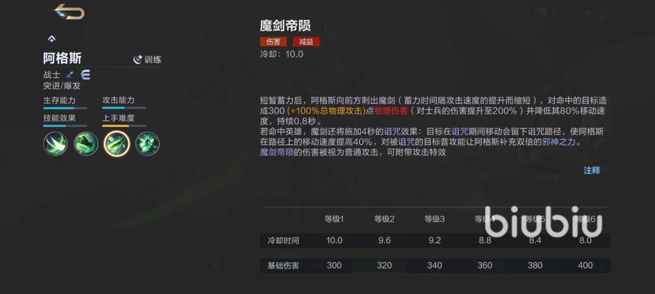 一技能向前方伸出魔能之手,命中敌人后眩晕目标,同时将自身和目标朝技能路径中间位置拉扯,再次点击使用后朝指定方向进行位移。二技能需要蓄力并且控制方向,然后刺出魔剑,对敌人造成伤害加减速效果,如果命中敌人,会对目标造成诅咒,敌人如果带着诅咒移动,会在脚下留下路径,阿格斯沿着路径追击移动速度增加。另外此路径还能起到防止对方卡视野、绕草丛这样的操作。对被诅咒的敌人进行普攻,会双倍恢复能量,加快触发被动效果。