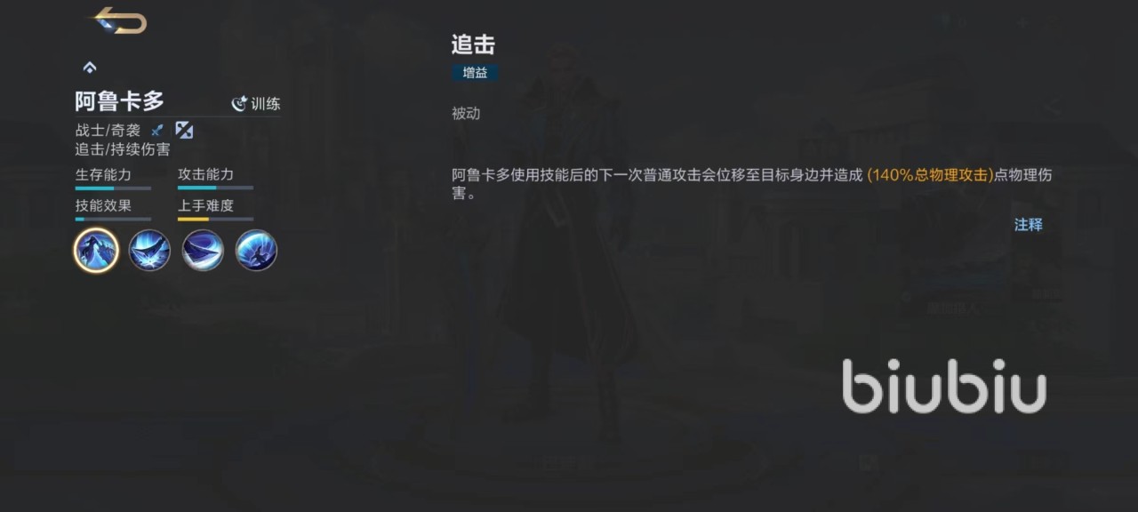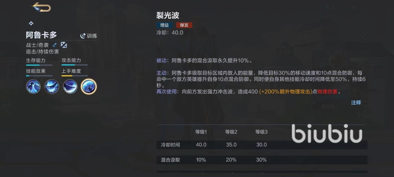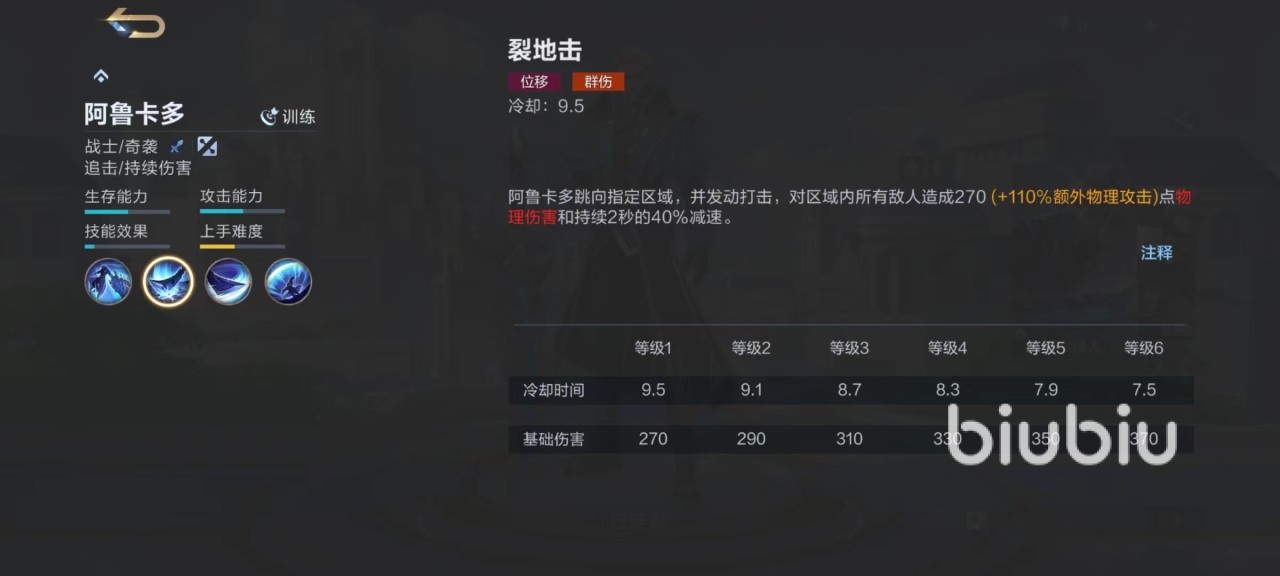 当阿鲁卡多使用任何一个技能后,下一次普攻都会附带额外效果,直接位移到目标身旁。一技能使用后跳向所指定区域,区域内所有敌人都将受到伤害和减速。二技能使用后将手中武器挥舞起来,造成一圈范围伤害,大招升级之后将会提升混合汲取效果,降低所有输出目标混合防御,同时自身防御得到提高。再次使用后发出冲击波,对前方目标造成伤害,在大招持续期间,其他所有技能冷却时间都将缩短。