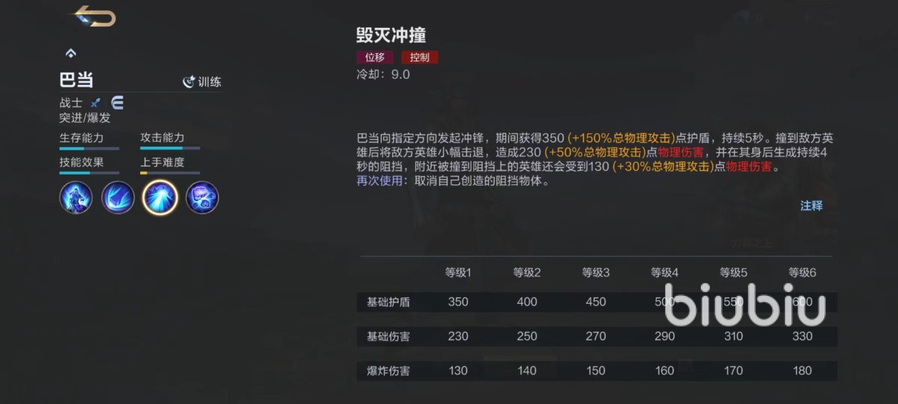 一技能需要手动调整释放路径,将路径上所有敌人击退附加伤害和减速,如果对方遇到阻碍,同样会受到额外伤害。一技能使用后可以直接触发被动击退和眩晕,最多能够储存两段。二技能也需要指定位置后发起冲锋,将对方撞倒后将其击退,自身还能获得护盾,此技能特点是使用之后直接在对方身后生成一个阻挡,这样就无需借助地形。二技能可以再次点击,将阻挡取消。三技能光速打出多拳造成伤害,可以直接触发被动效果,当敌人遇到阻挡时同样会被眩晕并产生爆炸伤害,在技能持续时间巴当本身是免疫控制的。